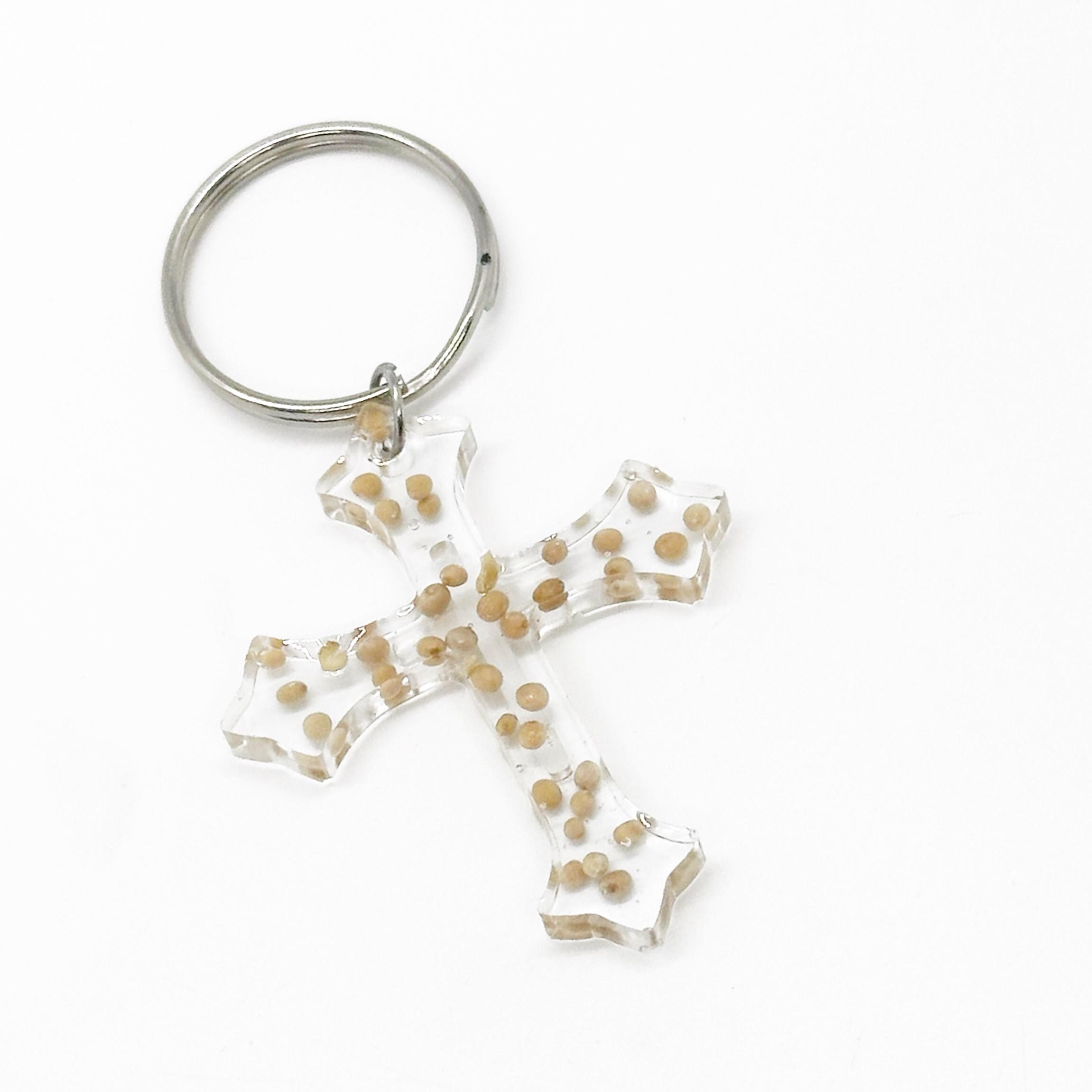 This is a great faith gift. It is a resin charm with mustard seeds to represent the scripture of Matthew 17:20. The charm measures approx. 1 inch across.