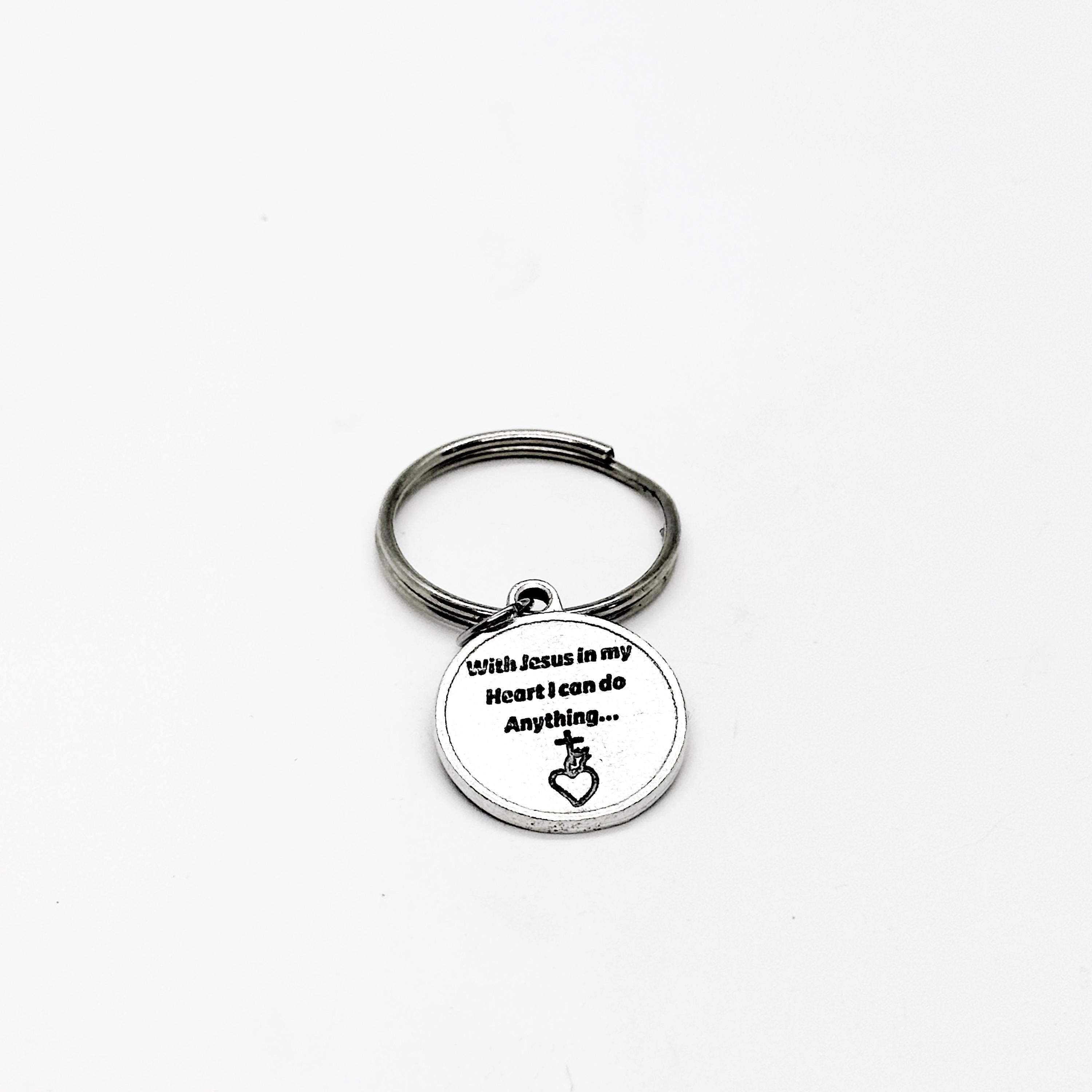 This is a wonderful keychain gift! It has a charm with Sacred Heart Of Jesus on the front and With Jesus in my heart I can do anything on the back on it. The charm measures approx. 3/4 inch.