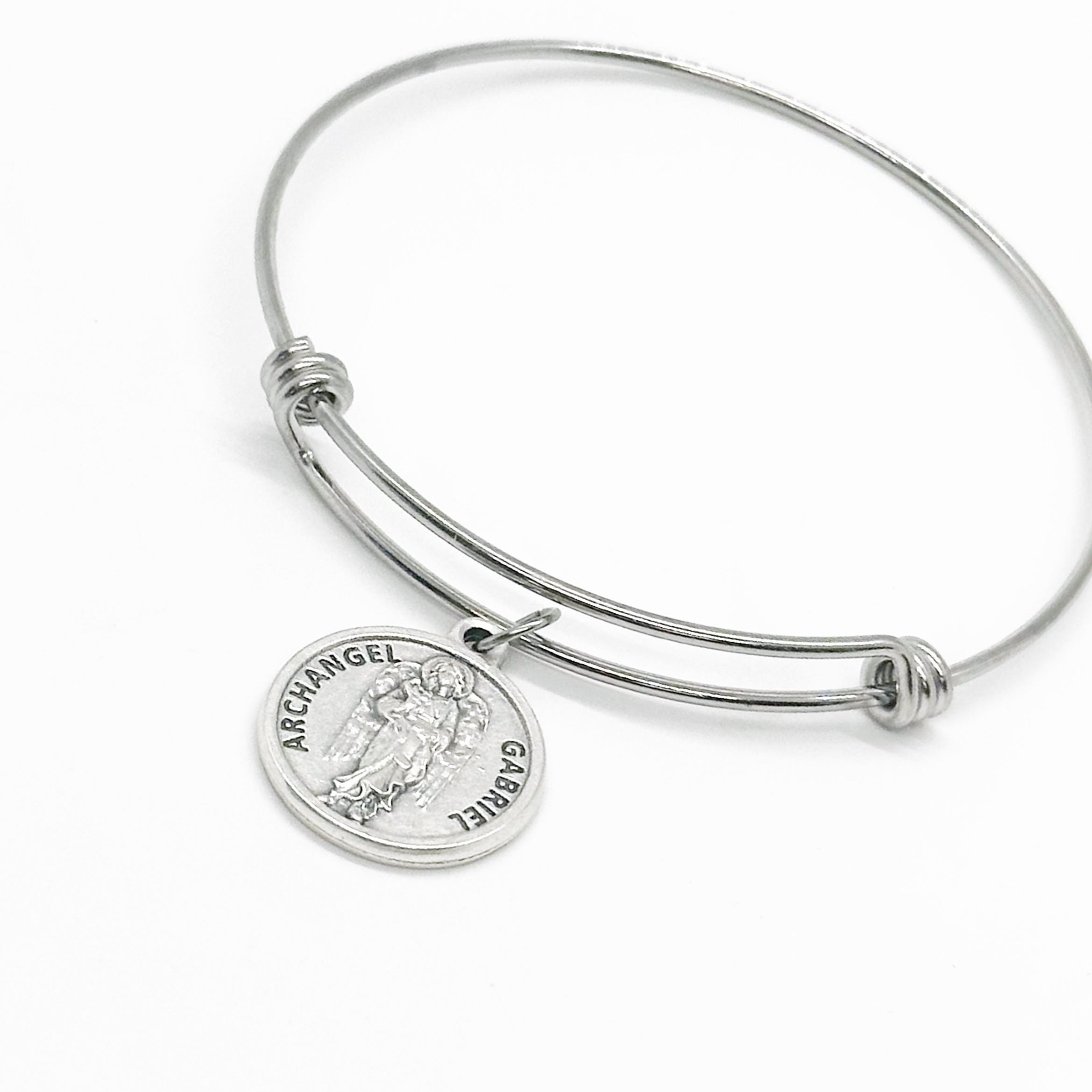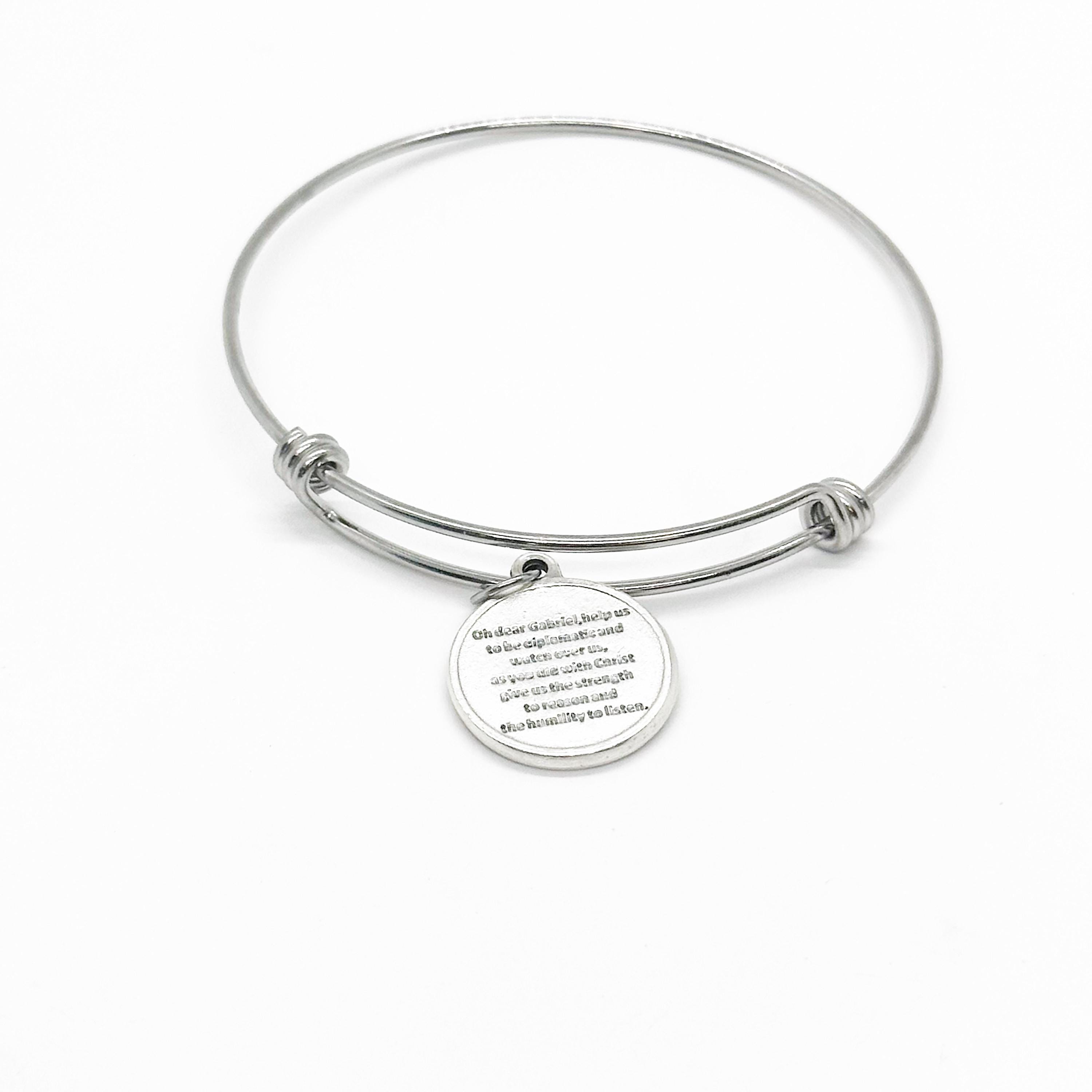 This is a beautiful bangle bracelet with a charm Archangel Gabriel on the front and Oh dear Gabriel, help us to be diplomatic and watch over us, as we die with Christ give us the strength to reason and the humility to listen on the back. The charm measures approx. 3/4 inch.