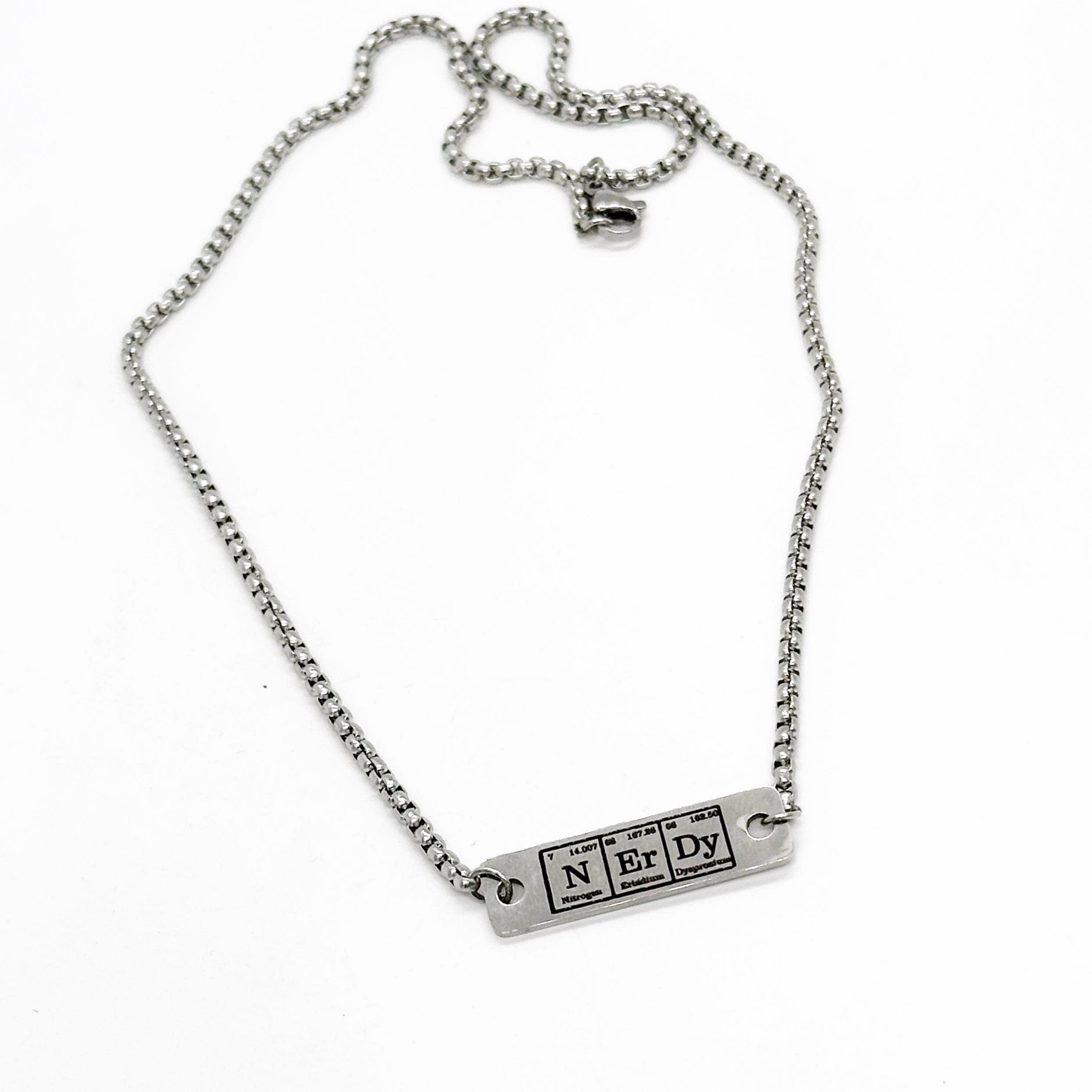 This is a beautiful stainless steel laser engraved “Nerdy" periodic table connector bar pendant on a stainless steel chain necklace in your choice of lengths. It would also be a beautiful gift for someone you love!
