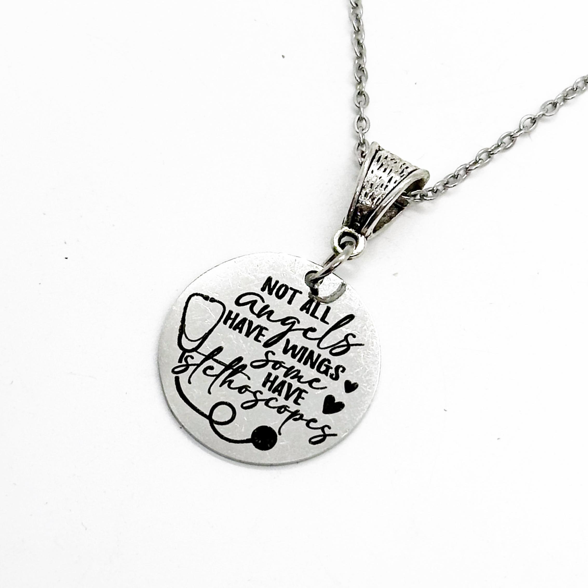 The pendant is a stainless steel laser engraved charm on a stainless steel link chain. The charm has the following on it: Not all angels have wings, some have stethoscope.