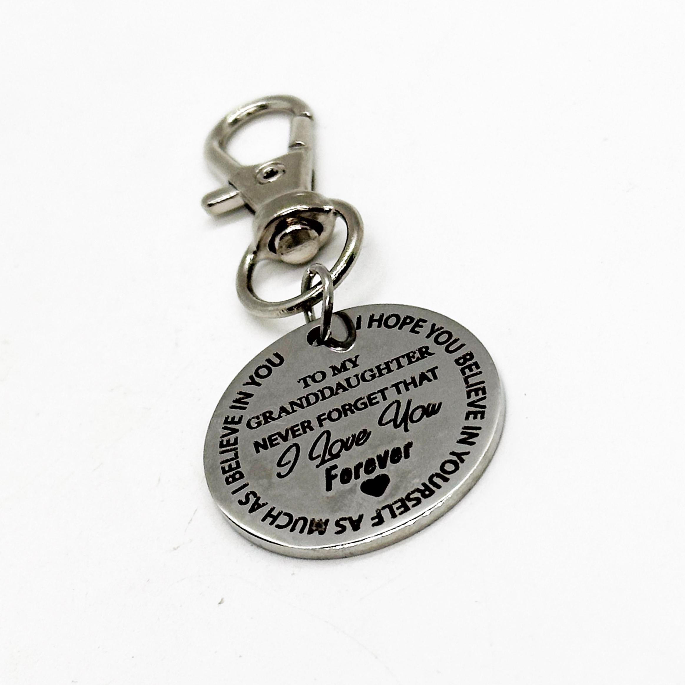This is a zipper pull which includes a stainless steel laser engraved charm with ” To my granddaughter Never Forget I Love you. I hope you believe in yourself as much as I believe in you”