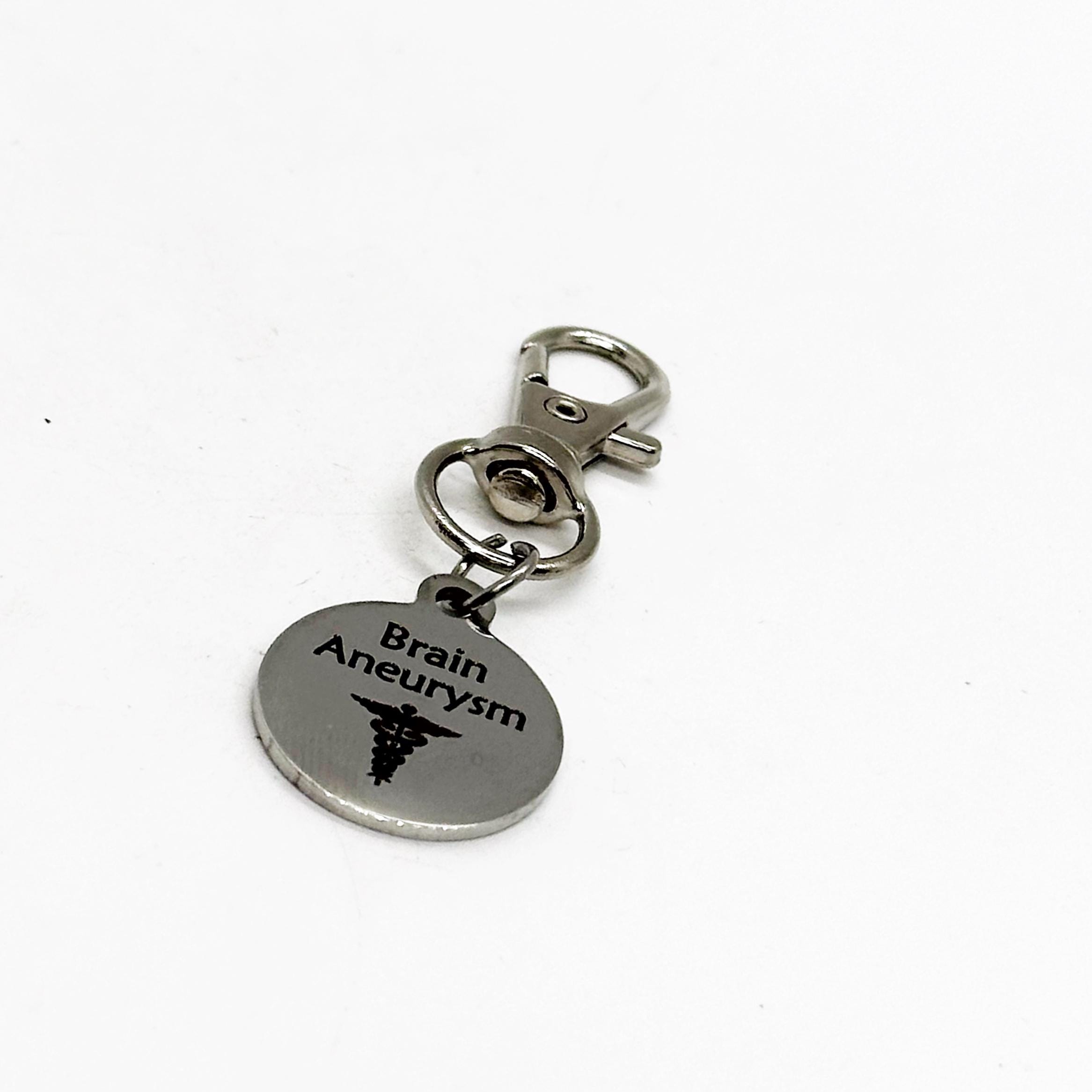 This is a zipper pull which includes a stainless steel laser engraved medical ID or medical awareness charm with “Brain Aneurysm” on it. The charm measures approx. 3/4 inch across.