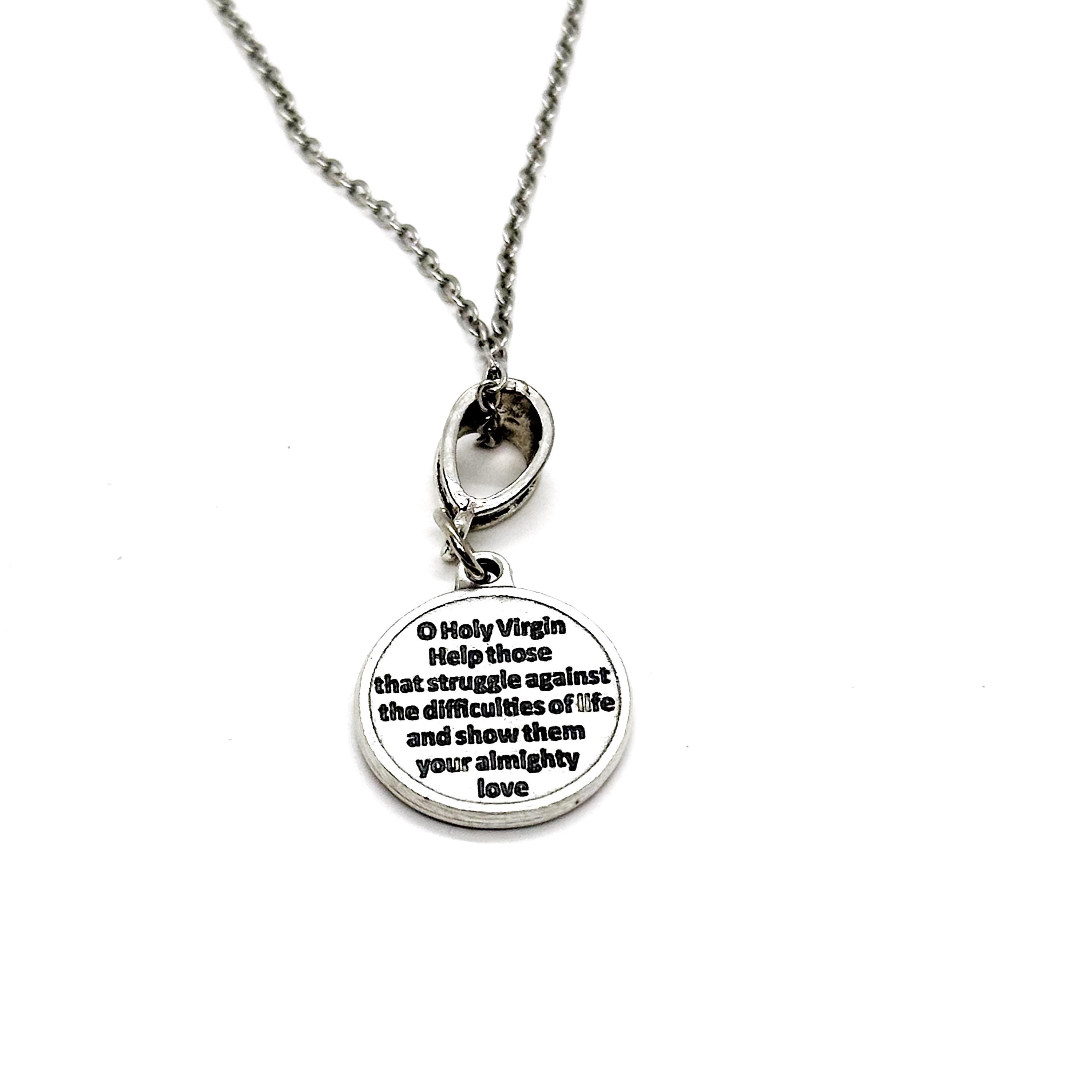 The is a beautiful jewelry piece that has a Saint Christopher charm with Our Lady of Lourdes with Saint Bernadette at the Grotto Medal Prayer on on the back.