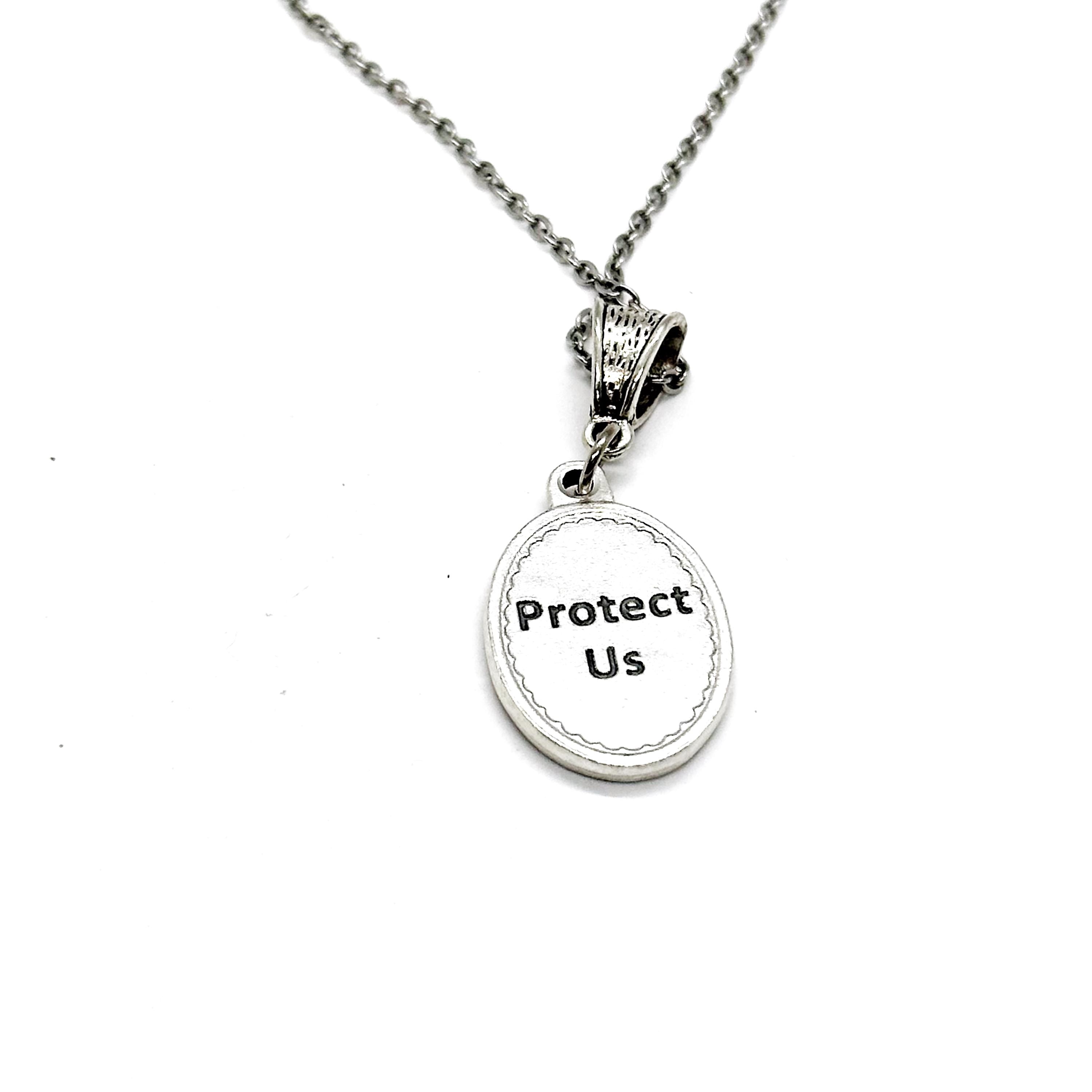 The is a beautiful jewelry piece that has Guardian Angel with Protect Us on the back.