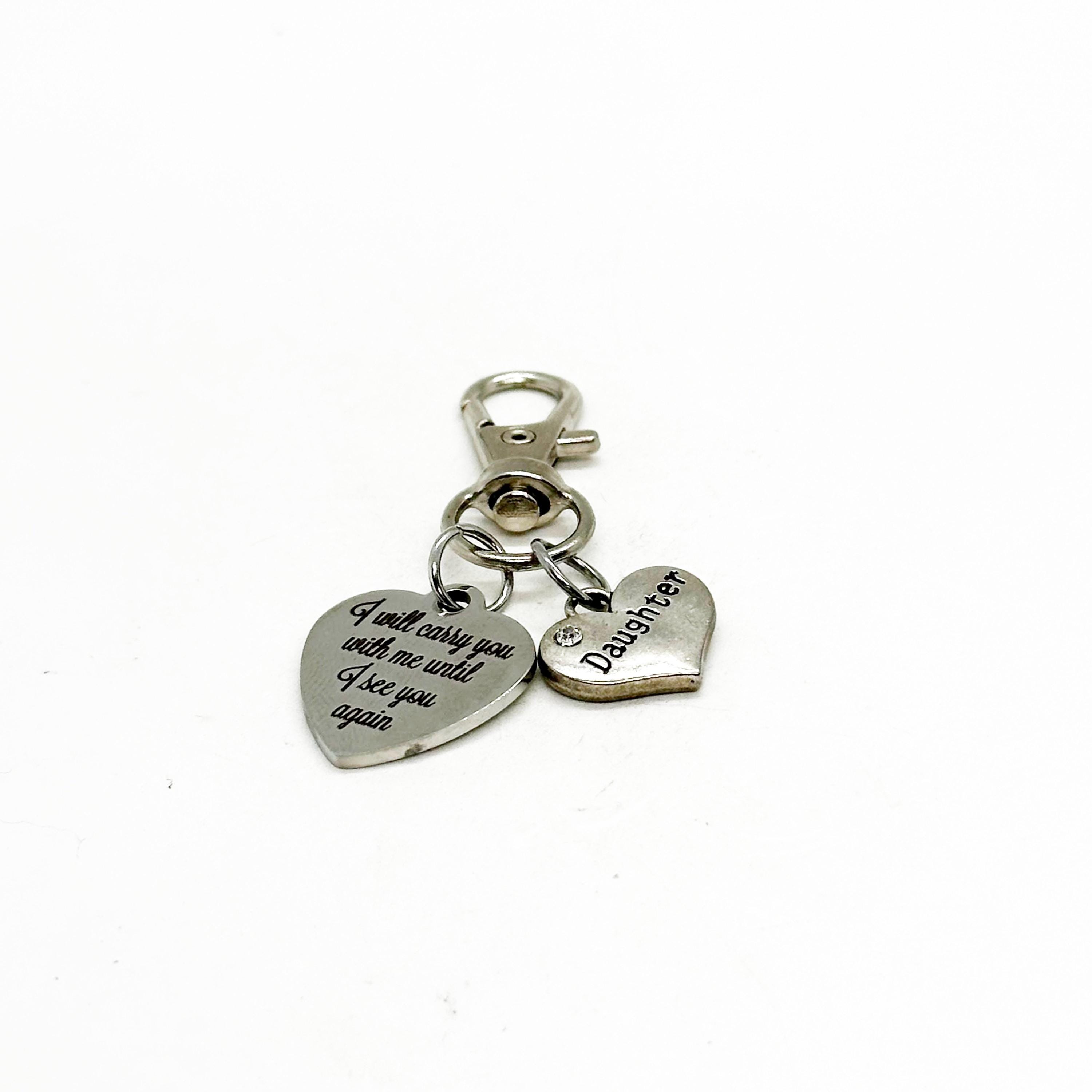 This clip on charm contains a stainless steel laser engraved charm that says "I will carry you in my heart until I see you again" along with a silvertone charm of your choice. This is a beautiful way to remember a loved one that is no longer with you.