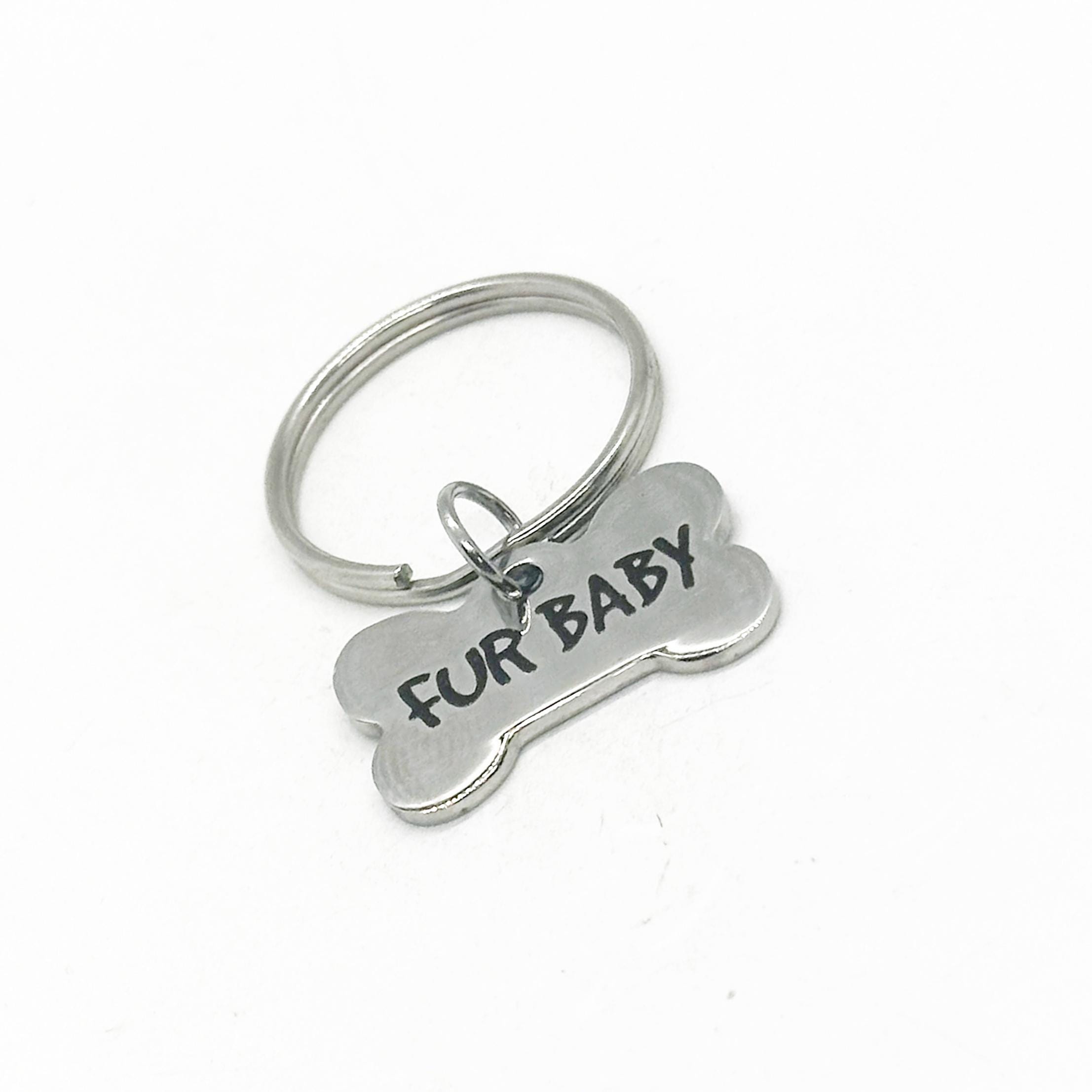 This is a great key chain gift. It has a stainless steel laser engraved charm that says, “Fur Baby”. The charm measures approx. 1 inch across.