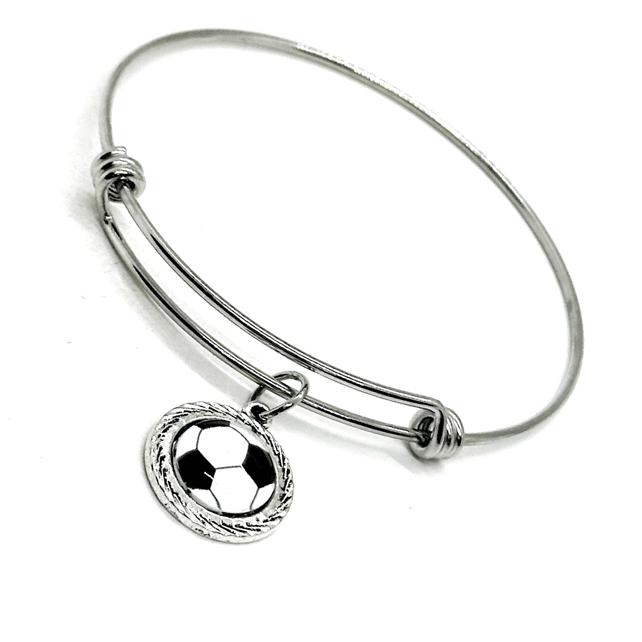 This is a beautiful bangle bracelet with a soccer ball charm on it.