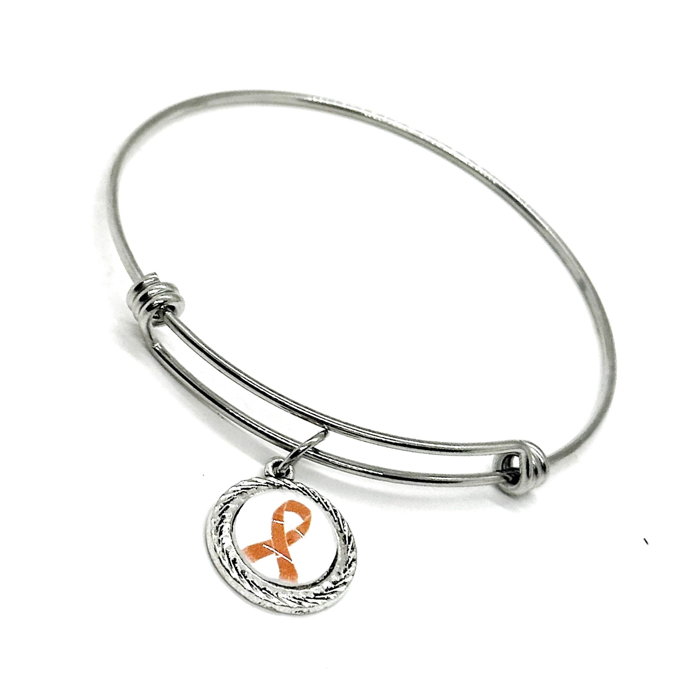 This is a beautiful bangle bracelet with a orange ribbon charm on it.