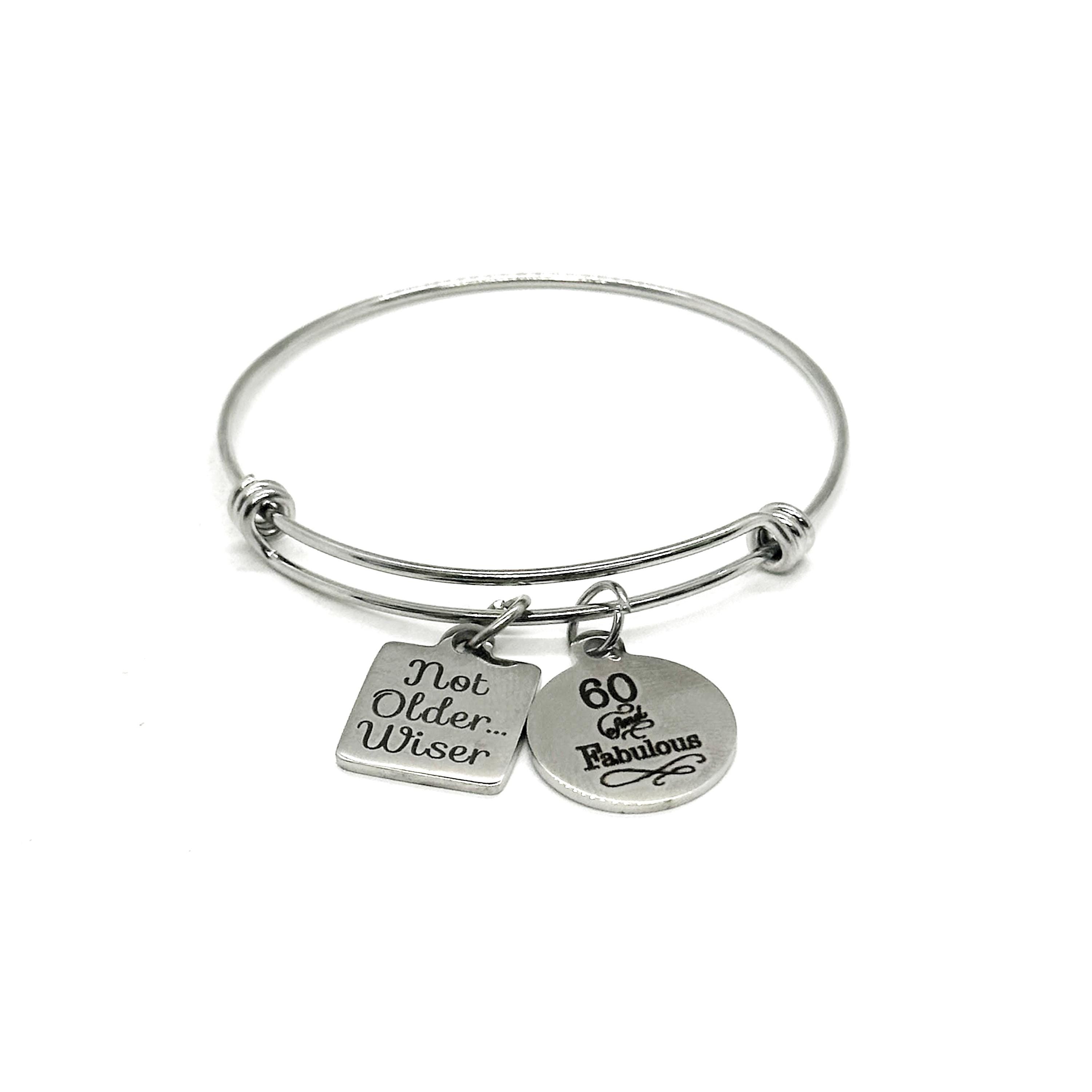 This is a beautiful bangle bracelet with 2 laser engraved stainless steel charms. One charm has "Not older... wiser" and the other has your choose of age and fabulous.