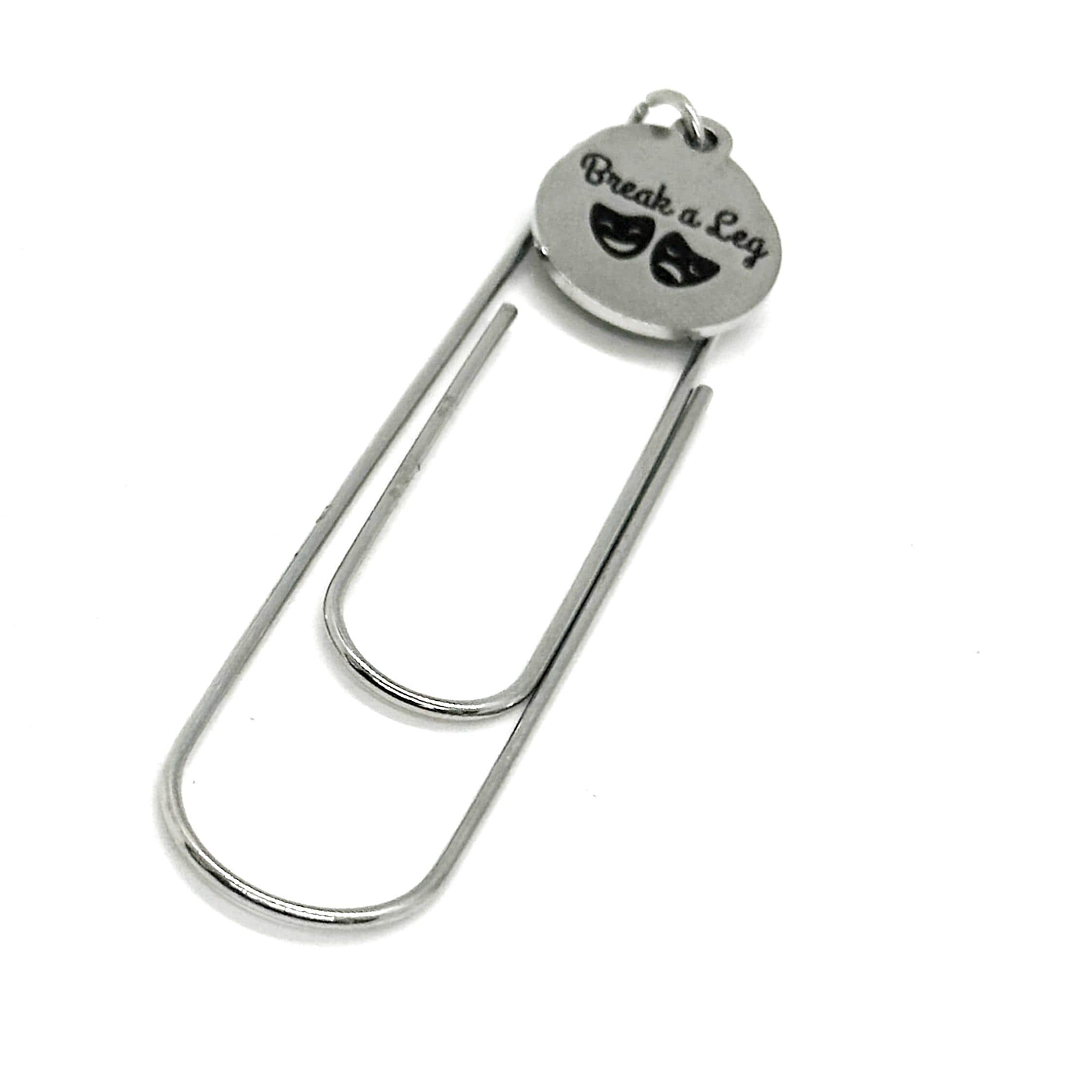 This bookmark has stainless steel laser engraved charm that has "Break A Leg" on it. It can be used as a bookmark, page marker, or planner book mark.