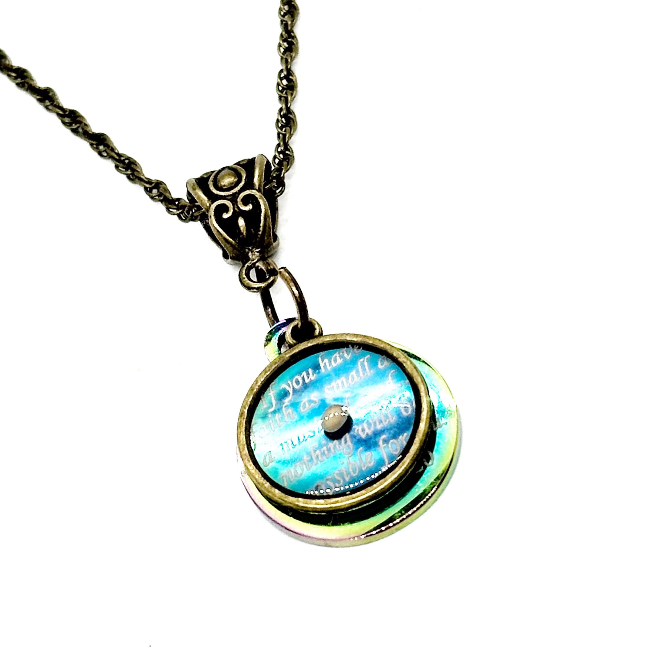 This is an antique brass necklace with a laser engraved Matthew 17:20 pendant and a charm containing a single mustard seed at the center. This necklace serves as a beautiful reminder that if we have the faith of a mustard seed, we can make things happen! This pendant is available on your choice of 16, 18, 20, 22 or 24 inch chain.