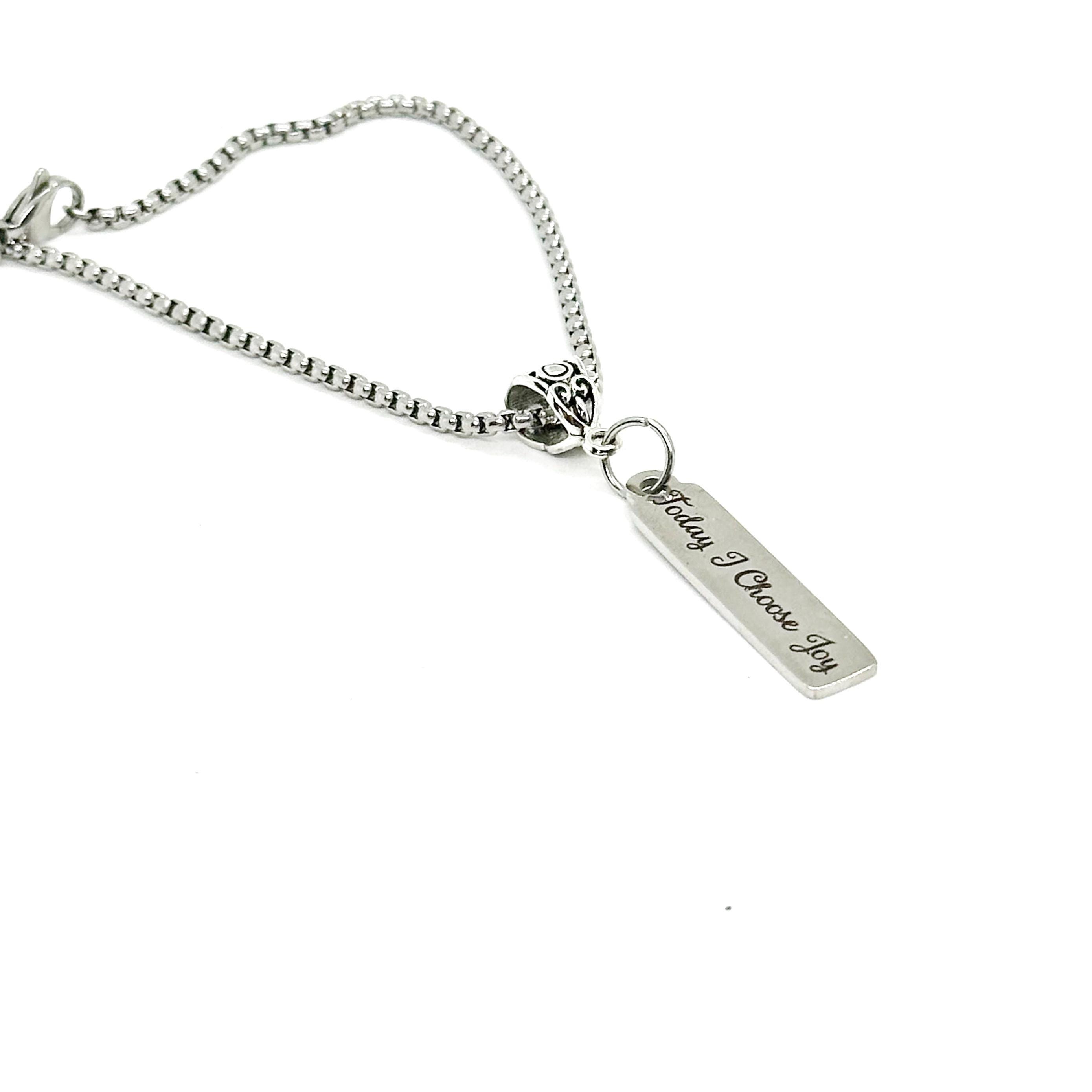 This is a beautiful bracelet with a stainless steel laser engraved charm with "Today I Choose Joy" on a silvertone European bail.