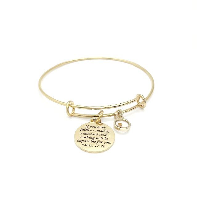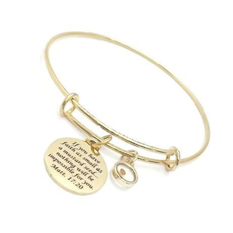 This is a beautiful goldtone bracelet with stainless steel engraved charm with “If you have faith as small as a mustard seed… nothing will be impossible for you” from Matthew 17:20 and a single mustard seed charm to remind us that with the faith of a mustard seed we can move mountains. The charm measures approx. 3/4 inch across. Each bracelet comes with a card with the scripture of Matthew 17:20.