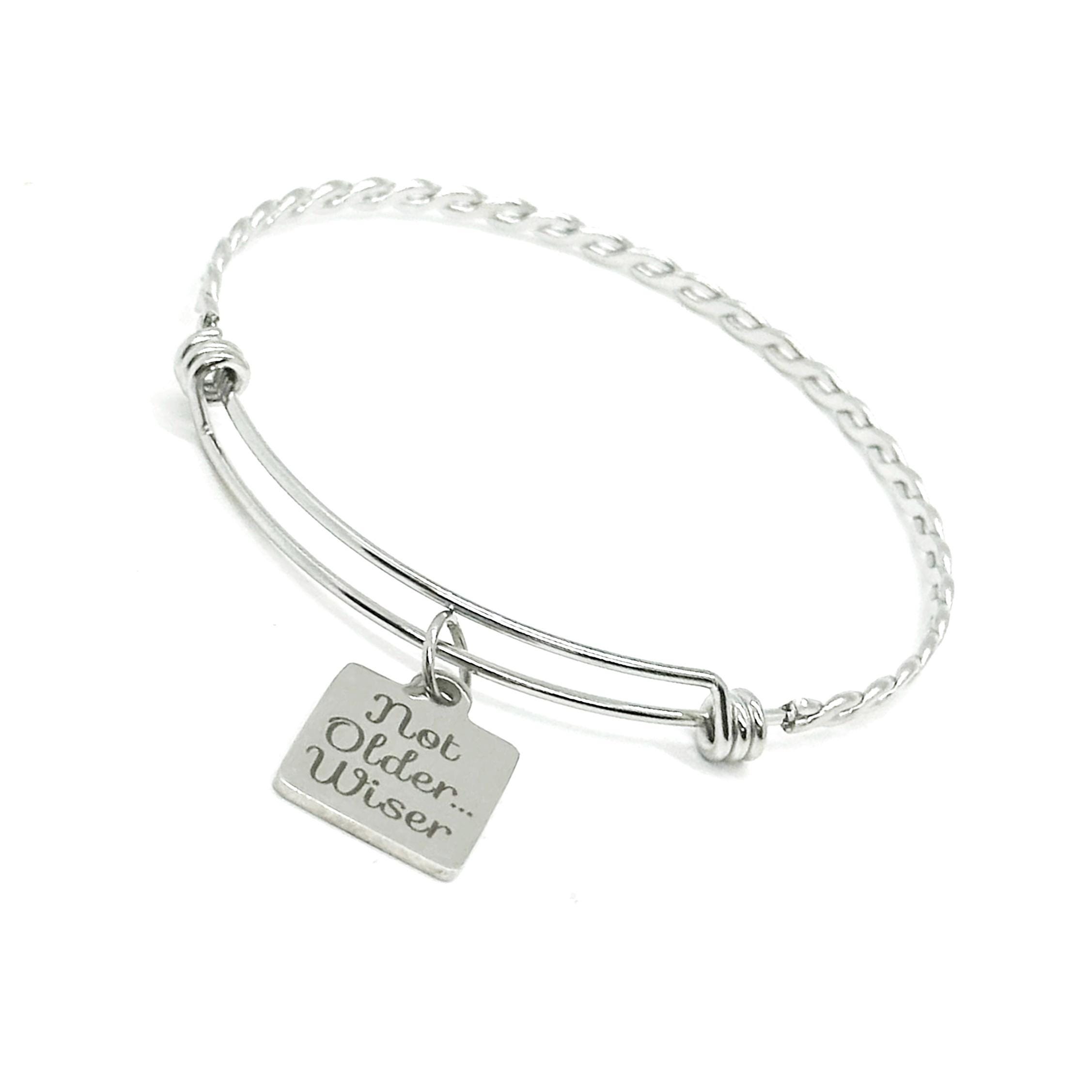 This is a beautiful stainless steel bracelet with a "Not older... wiser" engraved charm on it. The charm measures approx. 3/4 inch across.