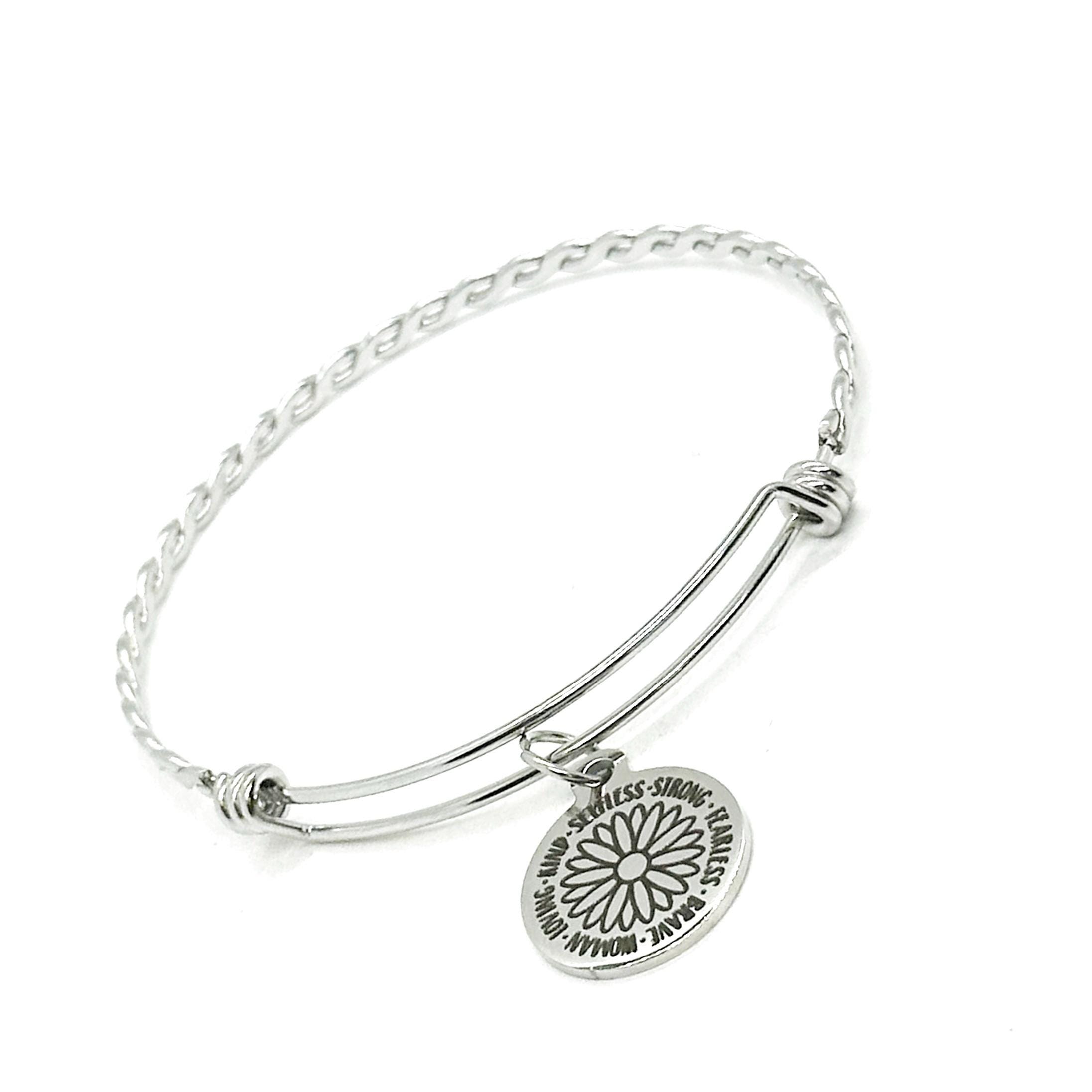 This is a beautiful stainless steel bracelet with a "Selfless, Strong, Brave, Loving, Kind, Woman" engraved charm on it. The charm measures approx. 3/4 inch across.