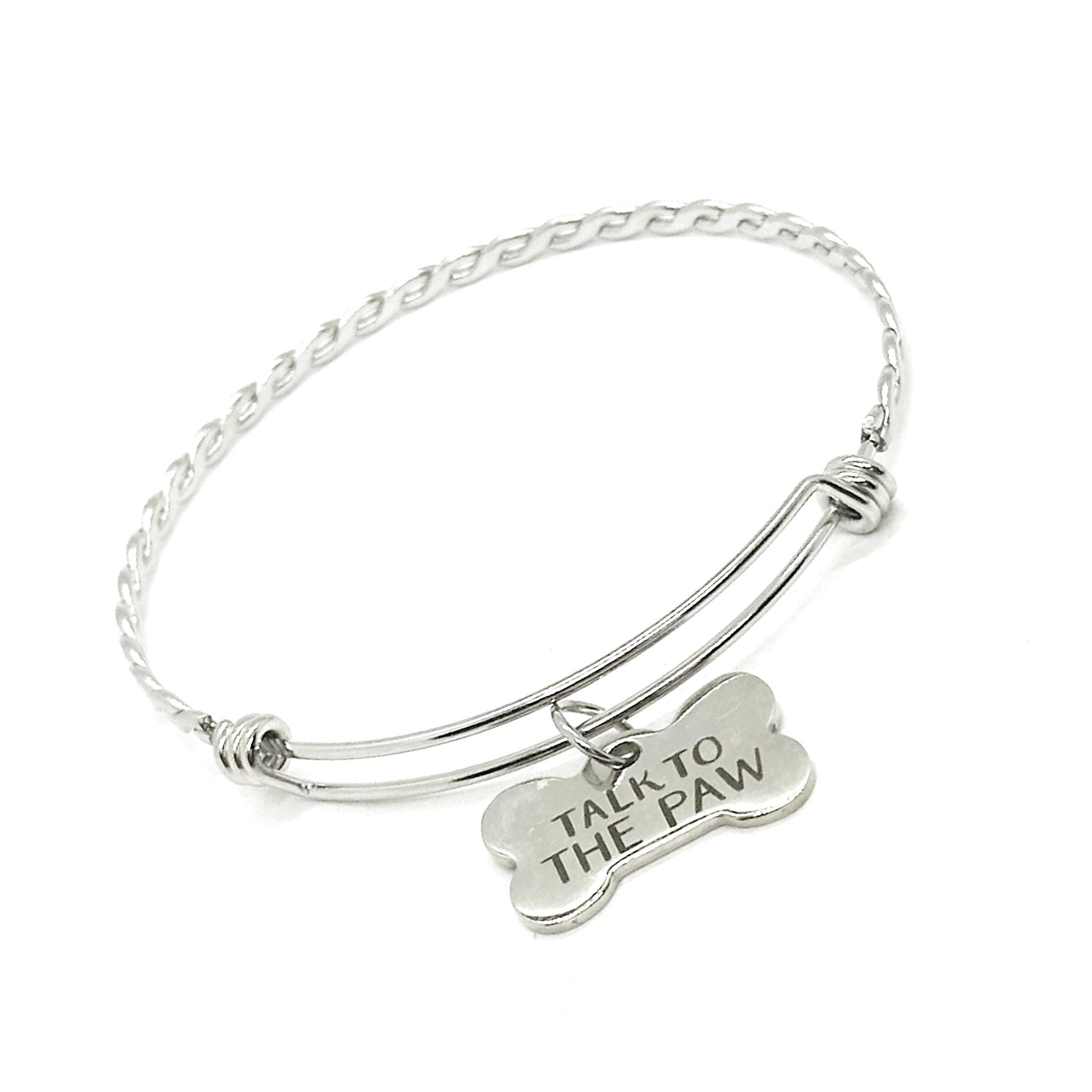 This is a beautiful stainless steel bracelet with a "Talk to the pay" engraved charm on it.