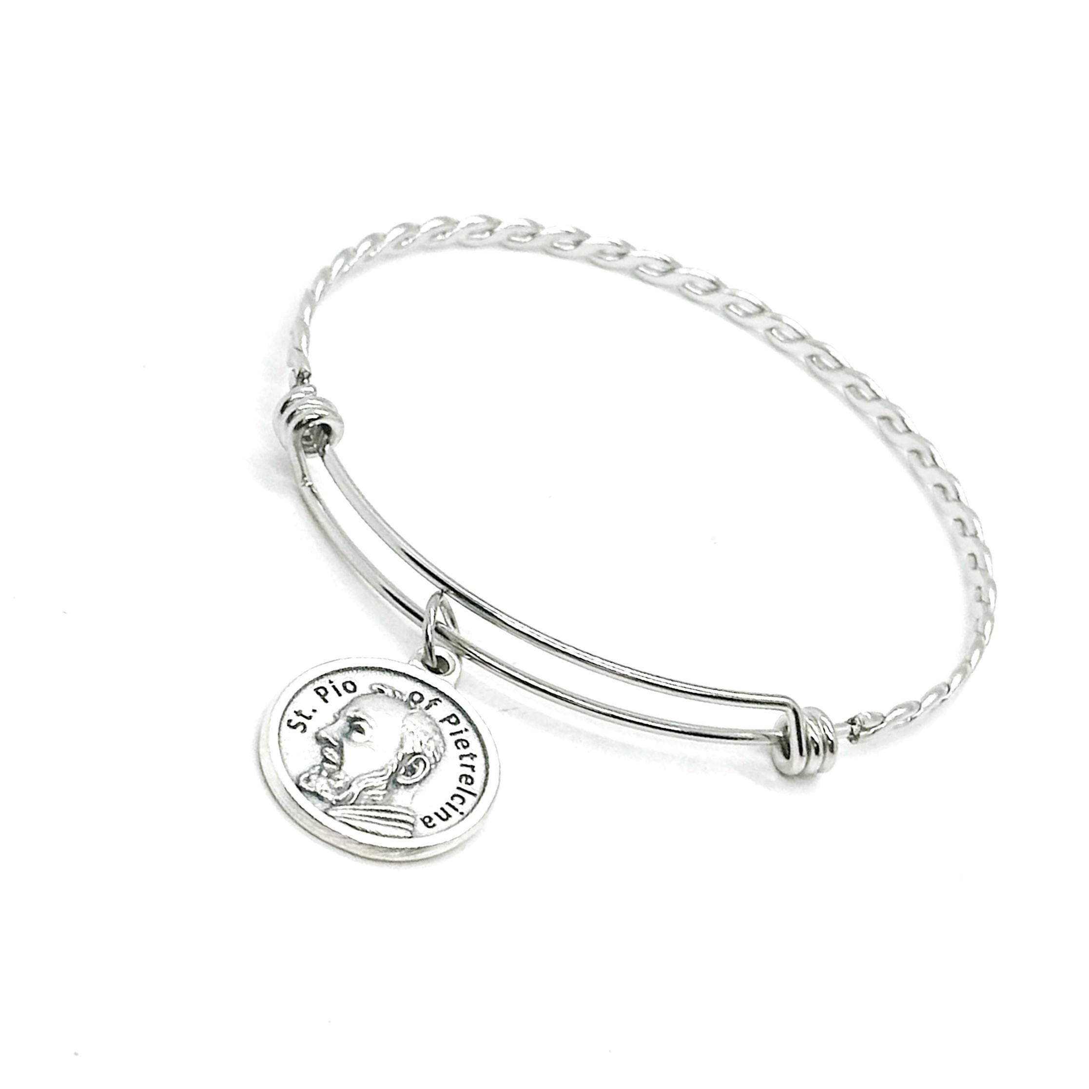 This is a beautiful stainless steel bracelet with a St. Pio of Pietrelcina charm on it. The charm measures approx. 3/4 inch across.