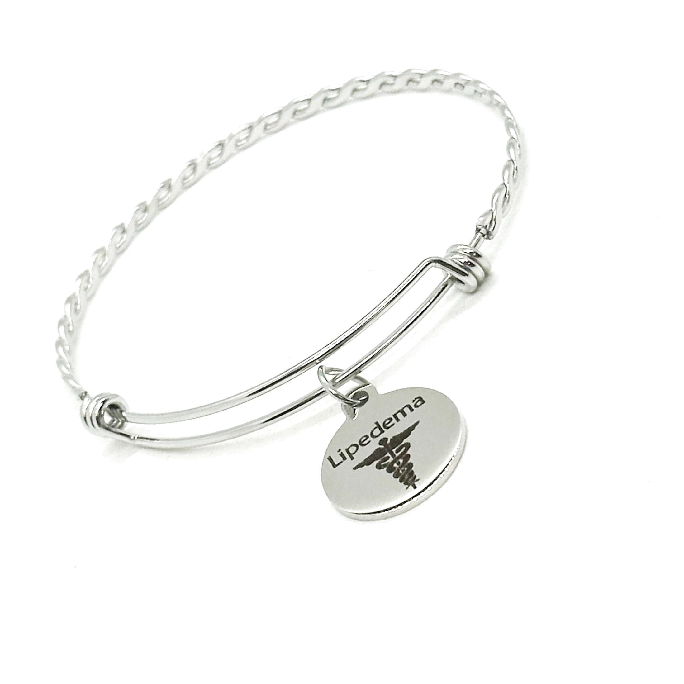 This is a beautiful stainless steel bracelet with an engraved charm with “Lipedema” and a medical caduceus image on it. The charm measures approx. 3/4 inch across