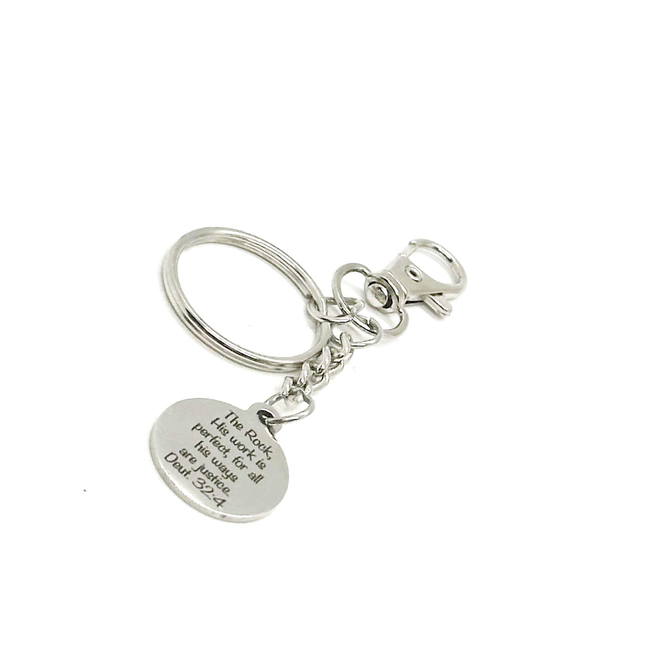 This is a great keychain gift. The keyring can be clipped onto your bag to make it easy to access without digging to the bottom of the bag. It has a stainless steel laser engraved charm with “The Rock, His work is perfect, for all his ways are justice." from Deuteronomy 32:4 on it. The charm measures 3/4 inch across.