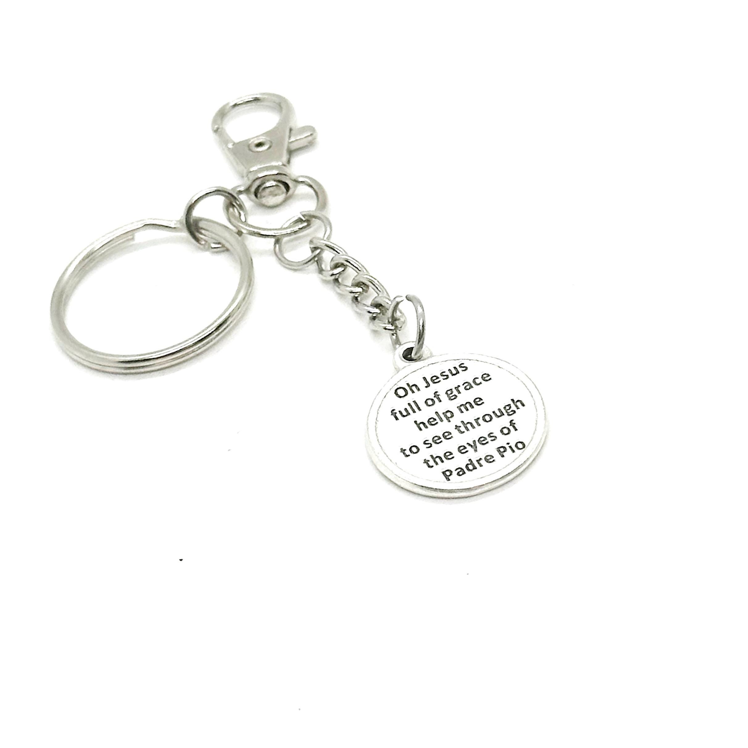 This is a great keychain gift. The keyring can be clipped onto your bag to make it easy to access without digging to the bottom of the bag. It has a Saint Pio of Pietrelcina charm on it.
