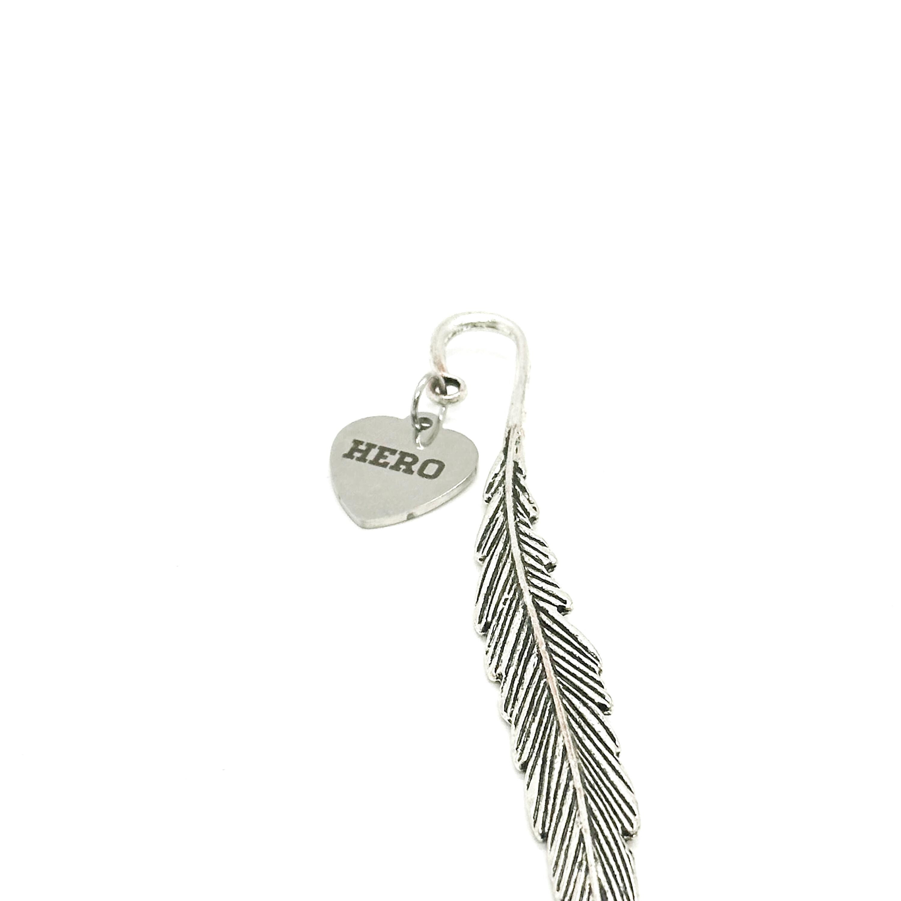 This bookmark would be a great planner gift bookmark or reader gift. It has a stainless steel laser engraved charm with "Hero" on it. The charm measures approx. 3/4 inch across.