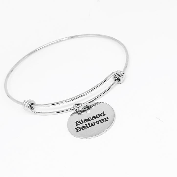 Celebrate your faith with this elegant “Blessed Believer” bracelet. Made of durable stainless steel, this adjustable bangle features a 23mm round charm engraved with an inspiring message — a daily reminder of grace, belief, and spiritual strength.