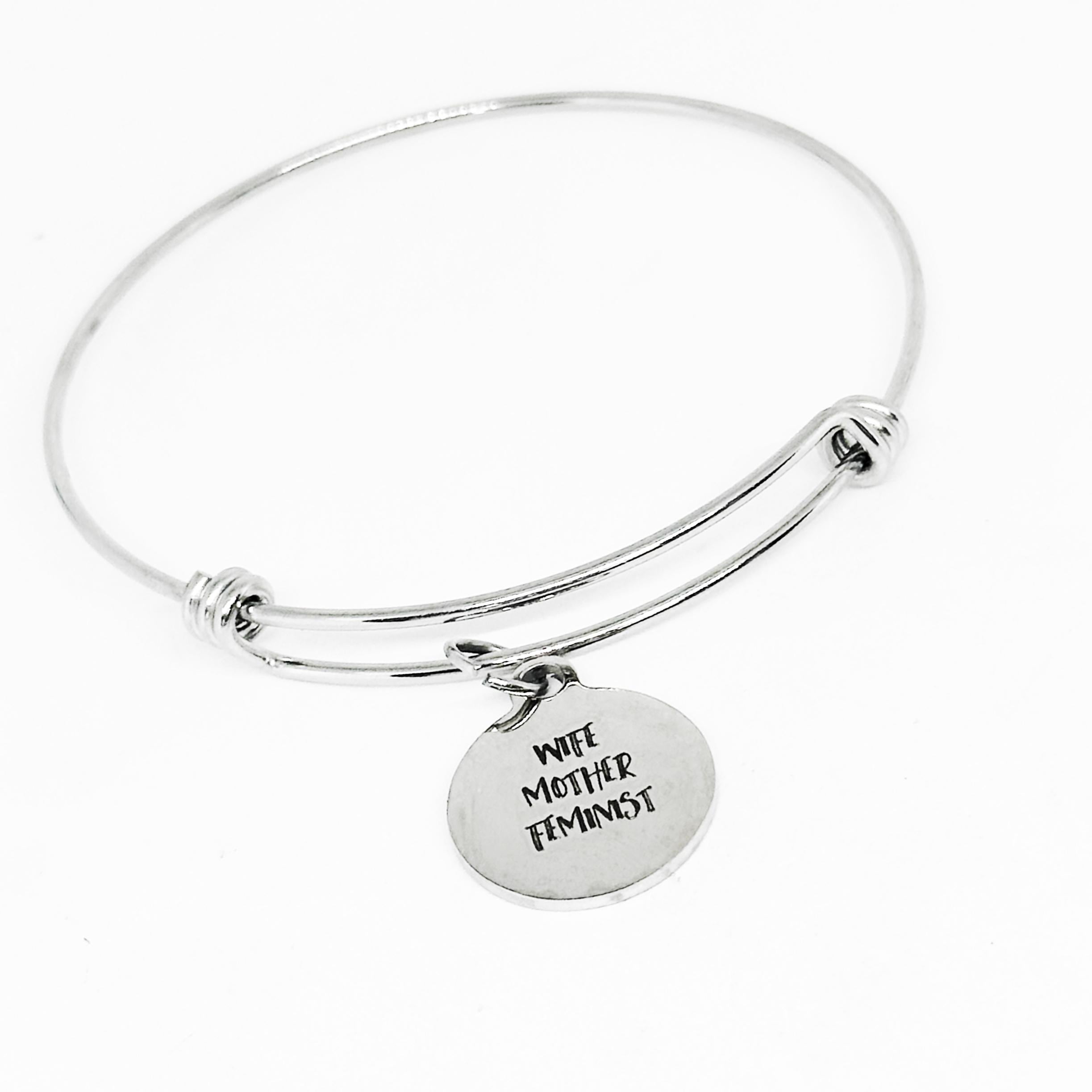 Celebrate strength, identity, and empowerment with this bold "Wife Mother Feminist" bracelet. Crafted from durable stainless steel, this adjustable bangle features a 19mm round charm engraved with a powerful statement — perfect for women who embrace every role with pride.