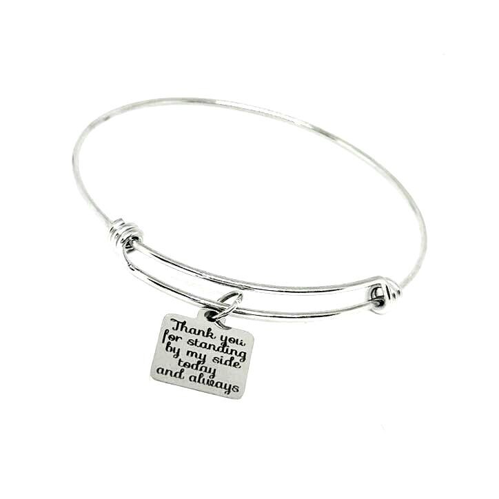 Show your heartfelt appreciation with this meaningful “Thank you for standing by my side today and always” bracelet. Made from durable stainless steel, this adjustable bangle features a 19mm square charm engraved with a touching message — a perfect token of gratitude and love.