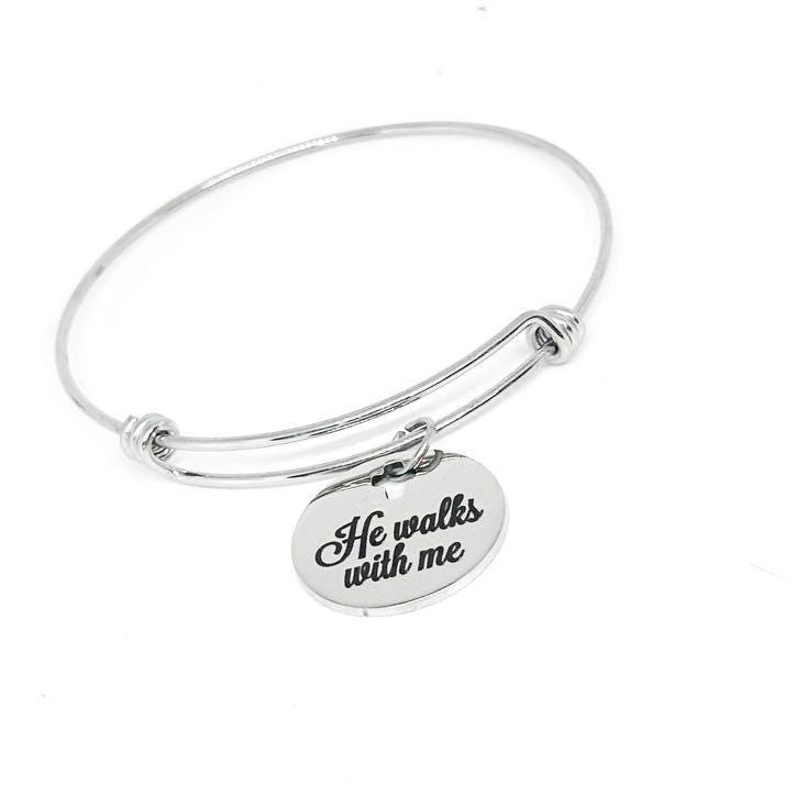 Keep faith close to your heart with this elegant “He walks with me” bracelet. Crafted from durable stainless steel, this adjustable bangle features a 25mm charm engraved with a comforting message — a beautiful reminder that you’re never alone.