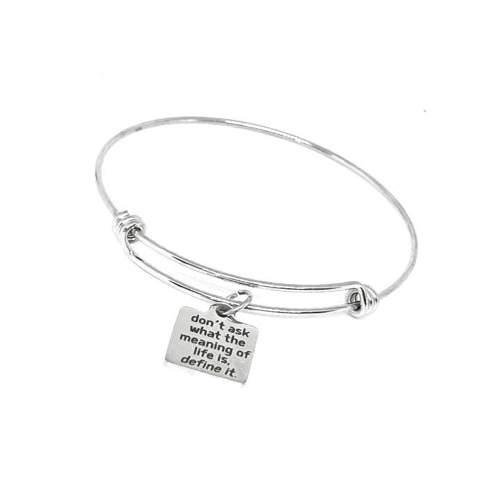 Empower yourself or someone special with this bold “Don’t ask what the meaning of life is, define it” bracelet. Crafted from stainless steel, this adjustable bangle features a 19mm square charm engraved with a powerful motivational quote — a reminder that we create our own purpose.