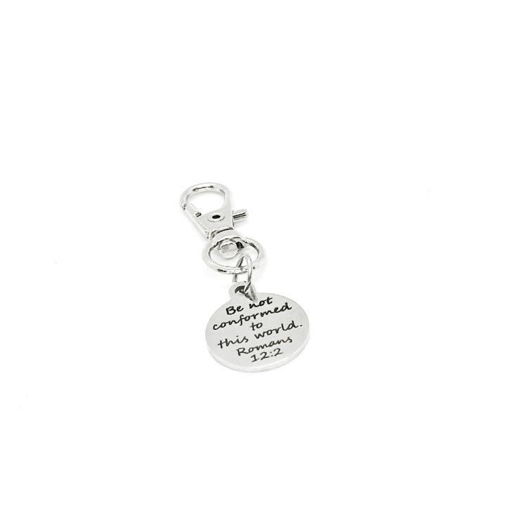 This stainless steel clip-on charm features the powerful scripture “Be not conformed to this world. Romans 12:2” engraved on a 19mm round charm. Perfect for attaching to purses, backpacks, keychains, zippers, or planners, this faith-based charm offers a meaningful reminder of staying true to your beliefs. A thoughtful gift for Christian friends or anyone in need of daily encouragement.