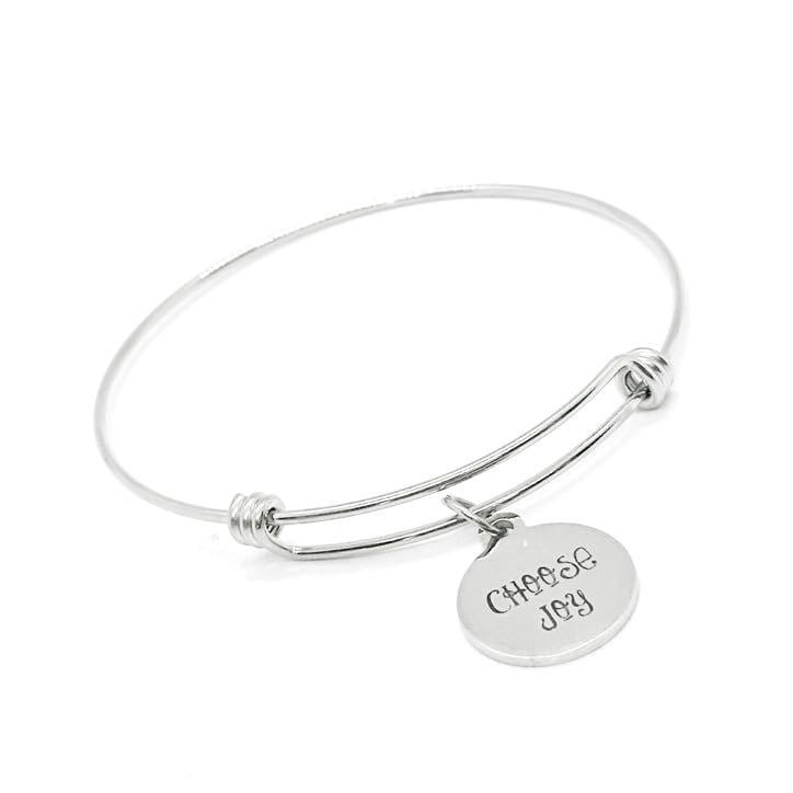 Embrace positivity with this beautiful "Choose Joy" charm bracelet. Crafted from stainless steel, it features a 19mm round charm with a simple yet powerful reminder to seek happiness each day. The adjustable bangle design ensures a perfect fit and lasting shine, making it a thoughtful gift for anyone needing encouragement or a daily dose of inspiration.