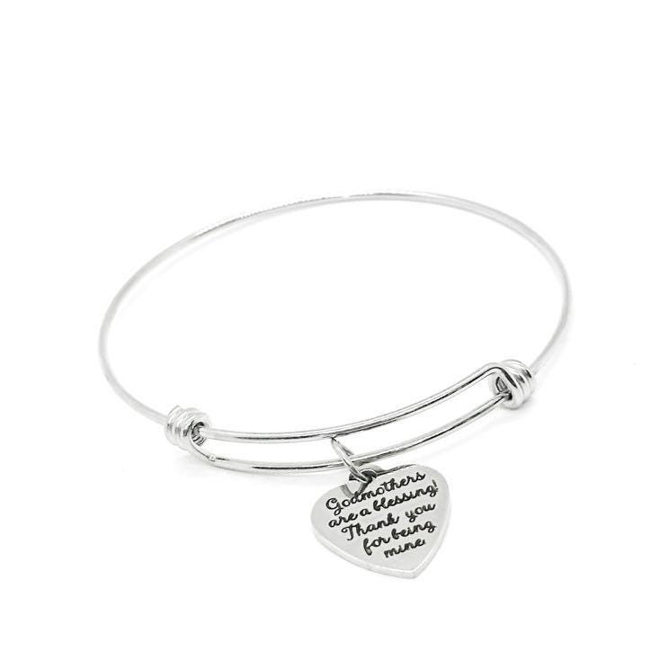 Celebrate the special bond between you and your godmother with this beautiful stainless steel charm bracelet. Featuring a heart-shaped charm engraved with the heartfelt message “Godmothers are a blessing. Thank you for being mine,” this bracelet is a meaningful and elegant way to show your gratitude. The charm measures approximately 19mm and dangles from a sleek, adjustable bangle that fits most wrist sizes. Perfect as a baptism thank you gift, Mother’s Day gesture, or just because.