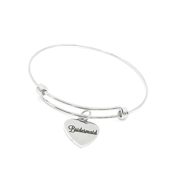 Show your appreciation to your bridesmaids with this elegant stainless steel charm bracelet. Featuring a polished heart-shaped charm engraved with "Bridesmaid," this beautiful bangle is the perfect keepsake for your wedding party. The charm measures approximately 19mm and hangs from a durable, adjustable bangle designed to fit most wrist sizes. Whether you're proposing to your bridesmaids or gifting them on your big day, this bracelet adds a special touch of gratitude and elegance.