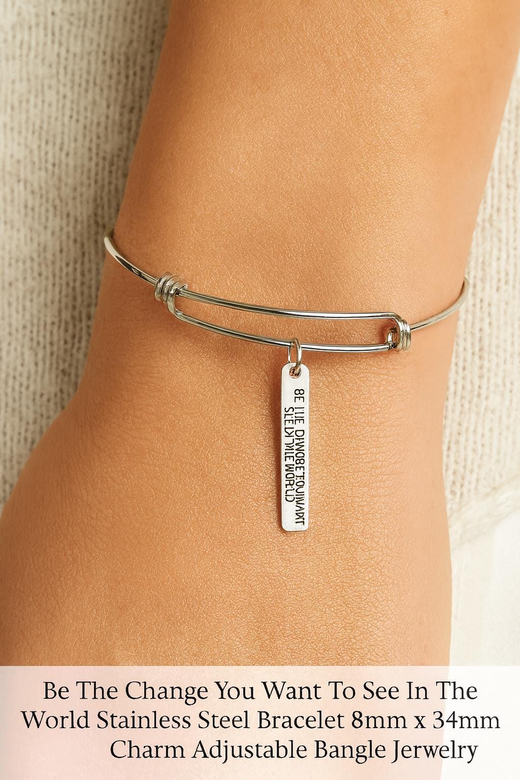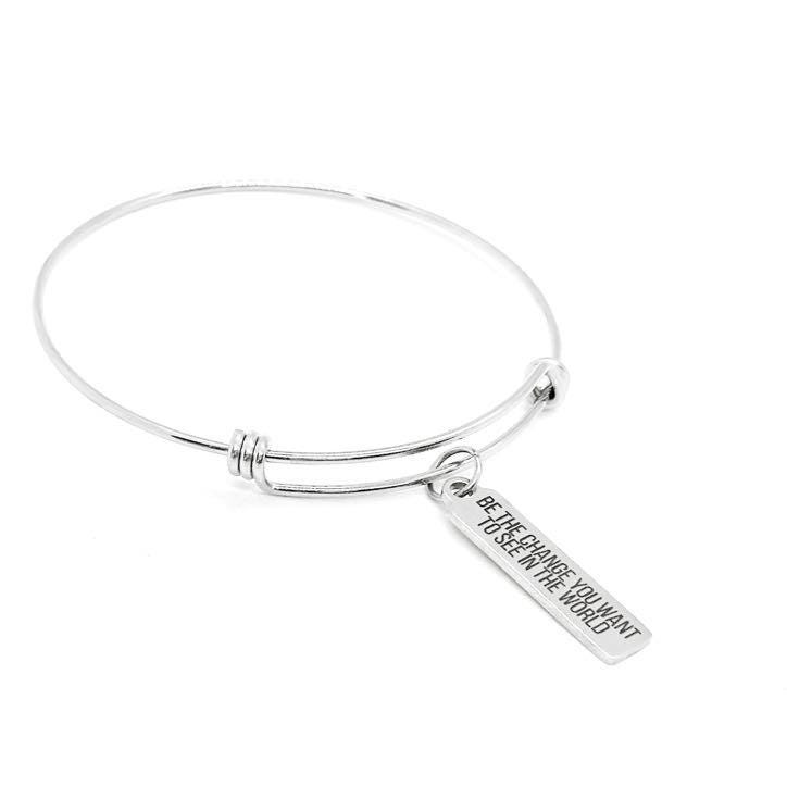 Inspire yourself and others every day with our Be the change you want to see in the world stainless steel bracelet. This elegant adjustable bangle features an 8mm x 34mm rectangular charm engraved with the iconic quote, making it a meaningful accessory for any outfit.