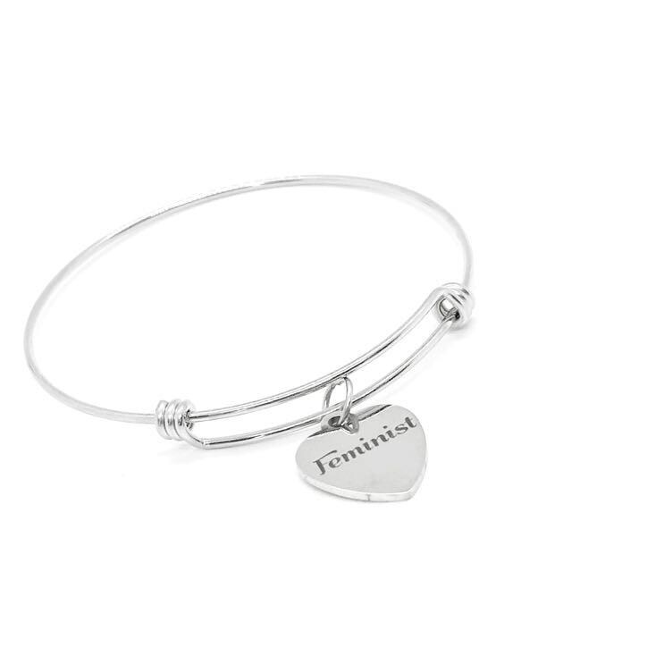 Show your support for equality and empowerment with this elegant Feminist bracelet. Featuring a sleek stainless steel adjustable bangle and a heart-shaped charm engraved with the word Feminist, this bracelet makes a bold yet stylish statement. The charm measures approximately 19mm, with a polished finish that catches the light beautifully. Perfect for everyday wear or as a thoughtful gift for someone who believes in equal rights and empowerment.