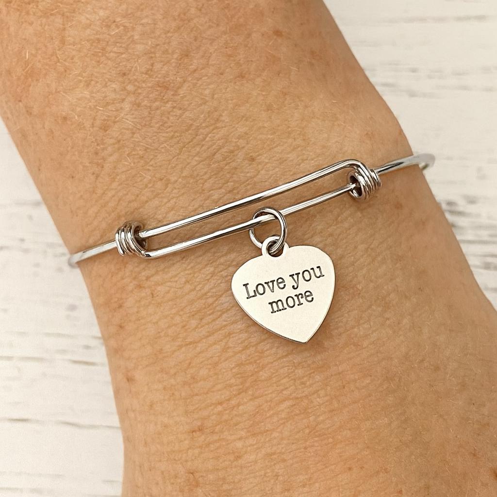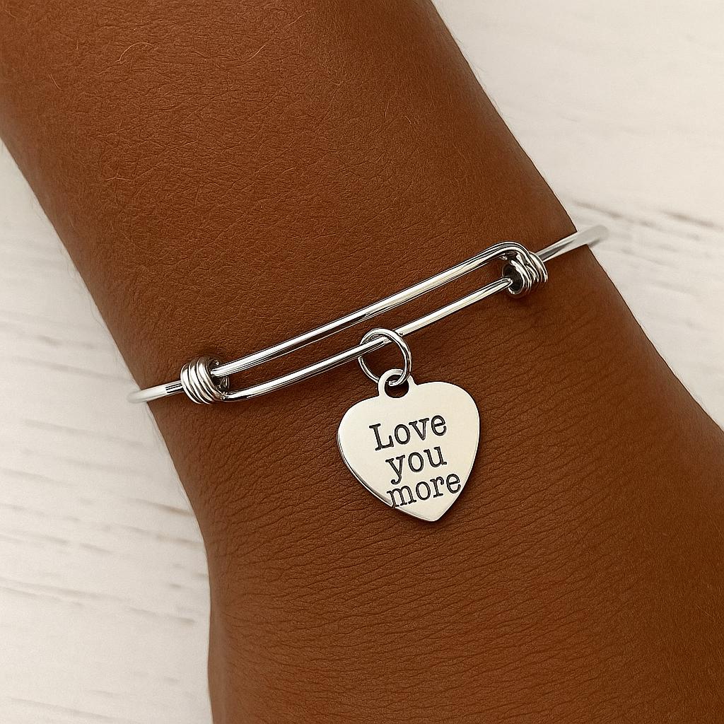 Celebrate your love with this Love You More bracelet, a timeless piece that carries a heartfelt message. The stainless steel adjustable bangle is both durable and elegant, featuring a 19mm heart-shaped charm engraved with the words Love you more. Its polished surface catches the light beautifully, making it a perfect everyday accessory or a romantic gift for someone special. Ideal for anniversaries, Valentine’s Day, birthdays, or just to remind a loved one how much they mean to you.