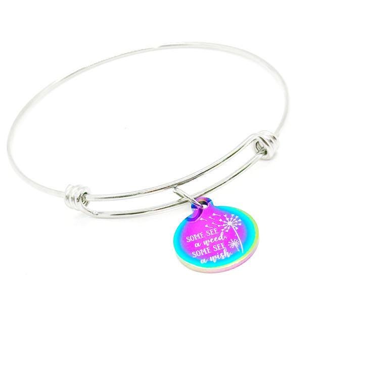 Add a splash of color and inspiration to your style with this Some See A Weed Some See A Wish bracelet. Crafted from durable rainbow stainless steel, this adjustable bangle features a 19mm round charm engraved with delicate dandelion designs and the uplifting phrase. The rainbow finish creates a unique iridescent shine, ensuring every bracelet is one-of-a-kind. Perfect for everyday wear or as a thoughtful gift for anyone who loves positivity, color, and nature-inspired jewelry.
