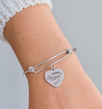 Celebrate your love for the sea and motherhood with this Mama Mermaid bracelet. Crafted from durable stainless steel, this adjustable bangle features a heart-shaped charm engraved with "Mama Mermaid" and playful bubble details. The charm measures approximately 19mm, making it the perfect size for everyday wear.
