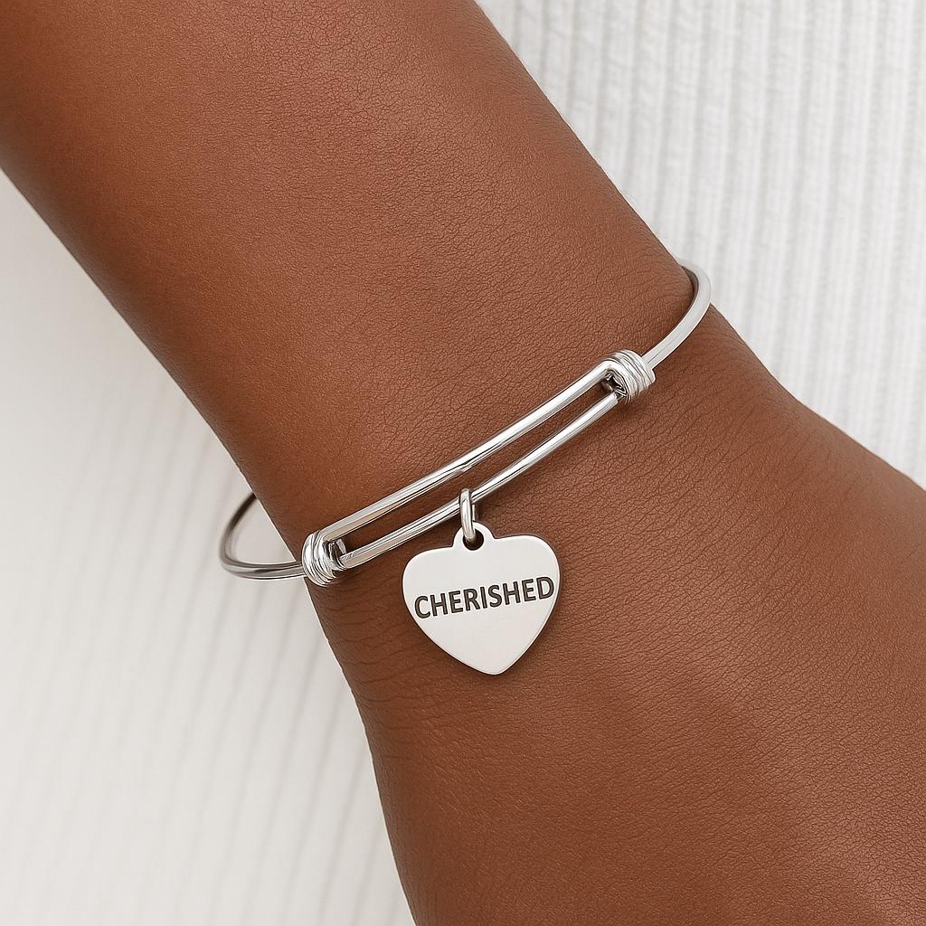 Celebrate meaningful moments with this Cherished Bracelet, a timeless piece designed to remind you of love, gratitude, and connection. The bracelet is made of high-quality stainless steel for durability and everyday wear. It features a heart-shaped charm measuring approximately 19mm, engraved with the word CHERISHED — a beautiful reminder of what matters most.