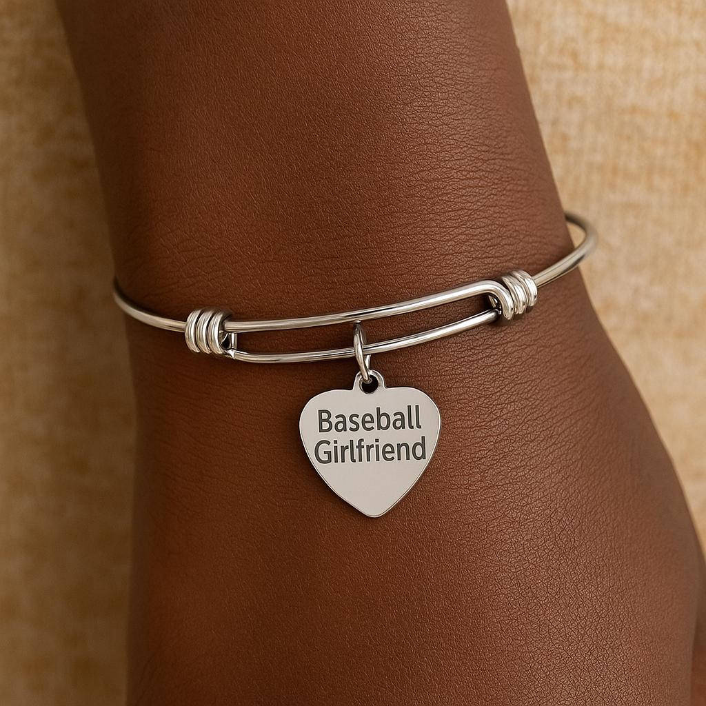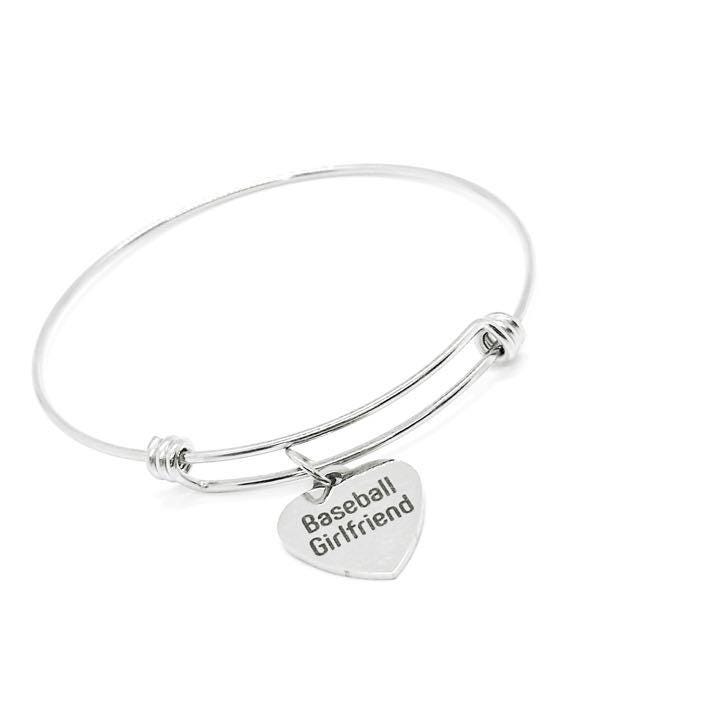 Show your team spirit with this stylish Baseball Girlfriend Bracelet. Crafted from durable stainless steel, this adjustable bangle features a 19mm heart-shaped charm engraved with the words Baseball Girlfriend.