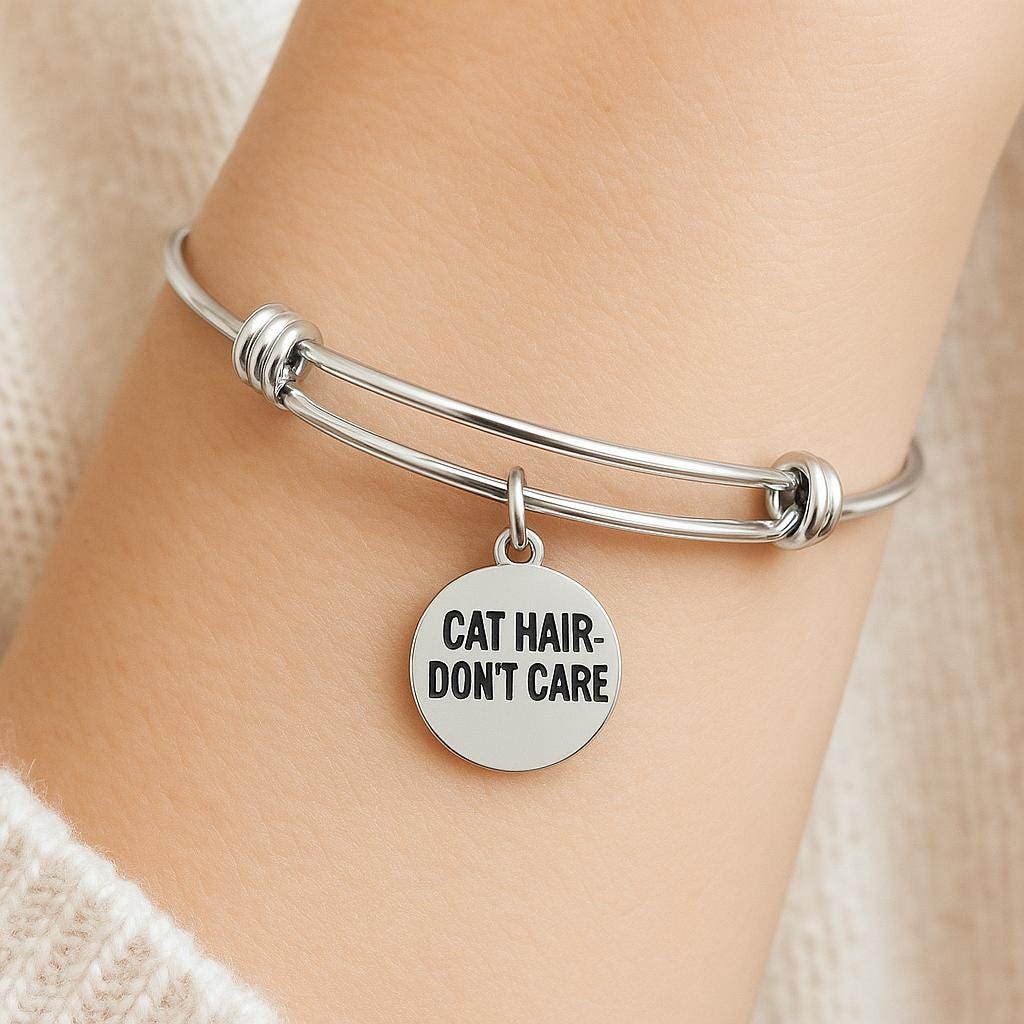Celebrate your love of cats with this playful Cat Hair – Don’t Care Bracelet. Made from durable stainless steel, this adjustable bangle features a round charm (approx. 19mm) engraved with the fun phrase Cat Hair – Don’t Care.
