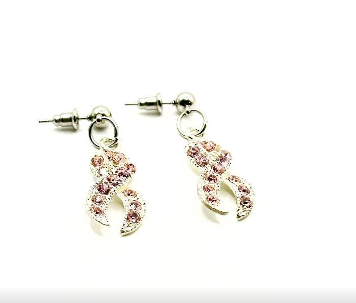 This is a great set of silvertone Pink rhinestone ribbon charm earring charms on stainless steel posts. The charms measure approx. 1 inch.