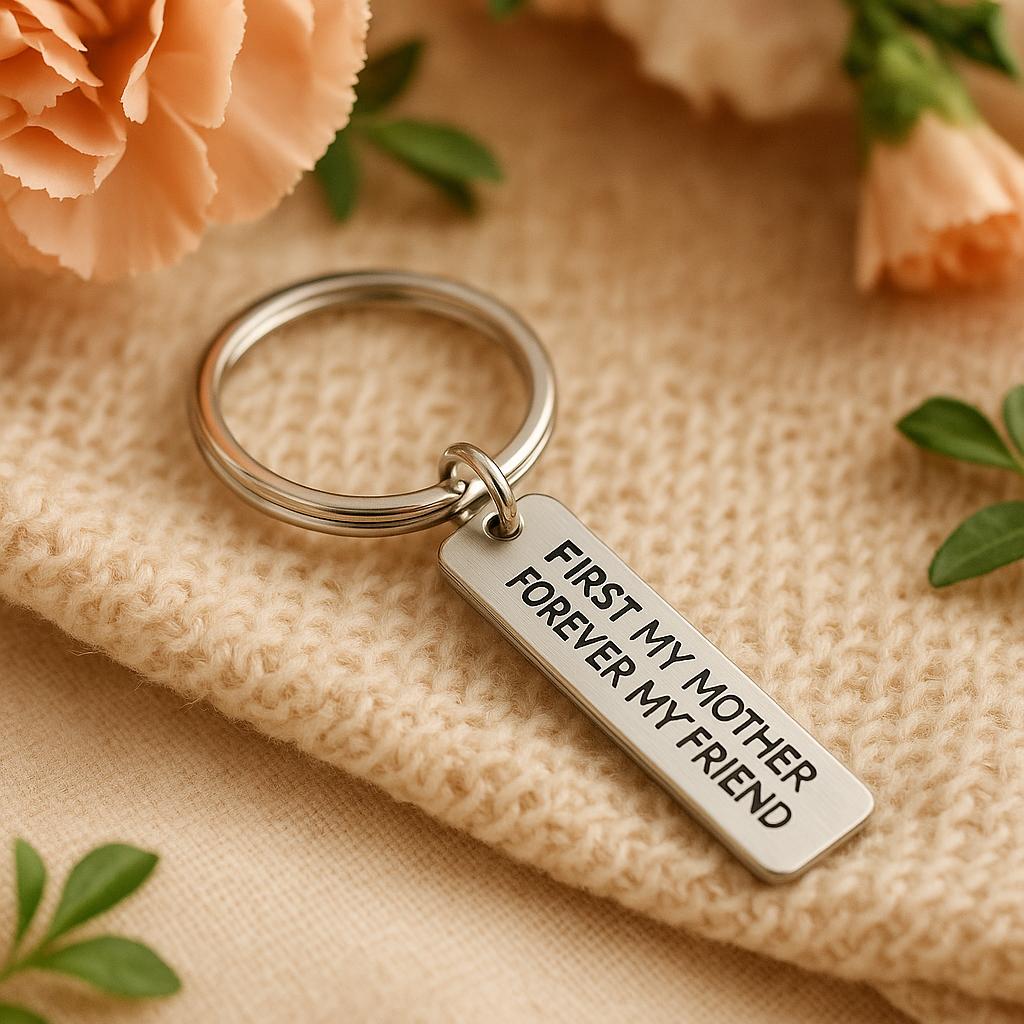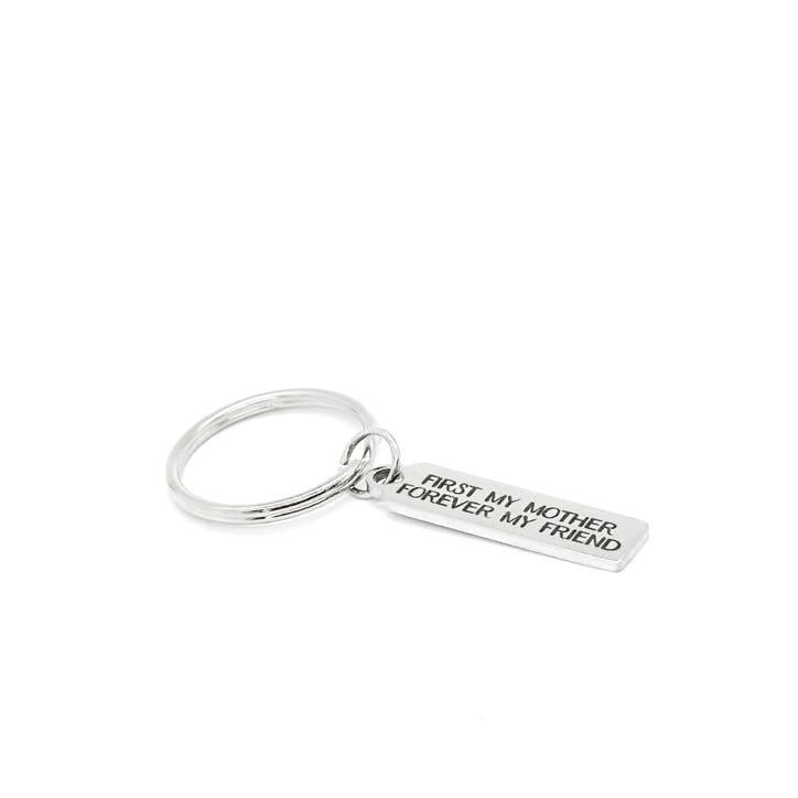 Celebrate the special bond between mother and child with this heartfelt First My Mother Forever My Friend keychain. Crafted from durable stainless steel, this rectangular charm measures approximately 8mm x 34mm and features a beautifully engraved message that honors the love and friendship shared with mom.