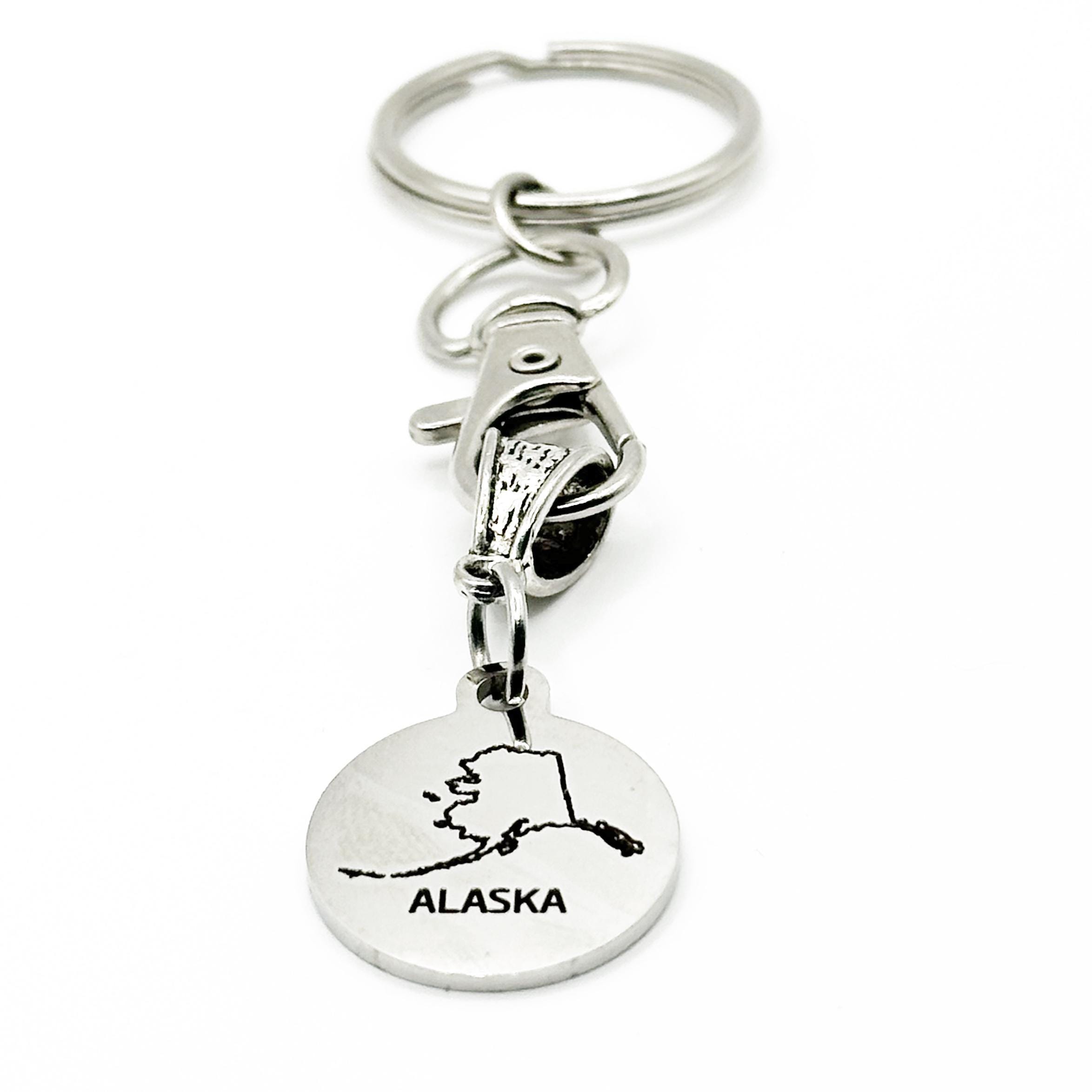 This is a great key chain gift to express your love of your home state. It has a stainless steel laser engraved charm with your choice of state on it. The charm measures approx. 3/4 inch across.
