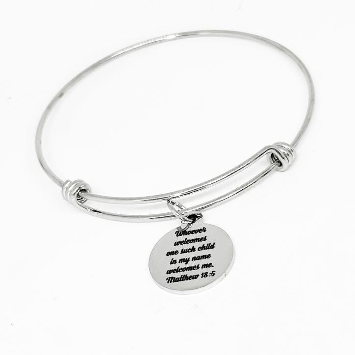 Carry a message of compassion and faith with this beautiful Matthew 18:5 stainless steel bracelet. The engraved round charm reads, “Whoever welcomes one such child in my name welcomes me. Matthew 18:5,” serving as a daily reminder of kindness, humility, and the love of Christ. The bracelet features a sleek, adjustable stainless steel bangle with a polished finish that pairs perfectly with any outfit. A meaningful gift for teachers, mothers, caregivers, and anyone guided by faith and love.