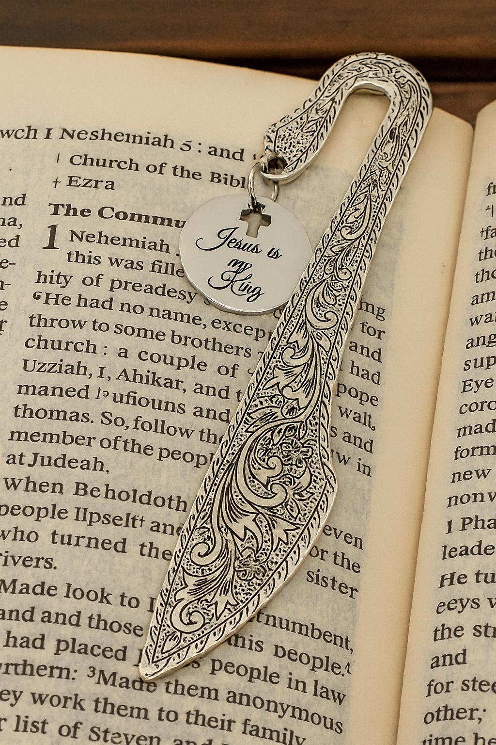 Elevate your reading time with this beautifully detailed faith-inspired bookmark from JKCE Designs. Crafted with an ornate silver design and paired with a 25mm stainless steel engraved charm that reads “Jesus is my King” in elegant Great Vibes font, this piece adds grace and devotion to every page. The charm features a cross cutout at the top where it connects to the 4.6-inch bookmark, symbolizing faith and inspiration. Perfect for Bible study, devotionals, or as a meaningful gift for someone special in your life.