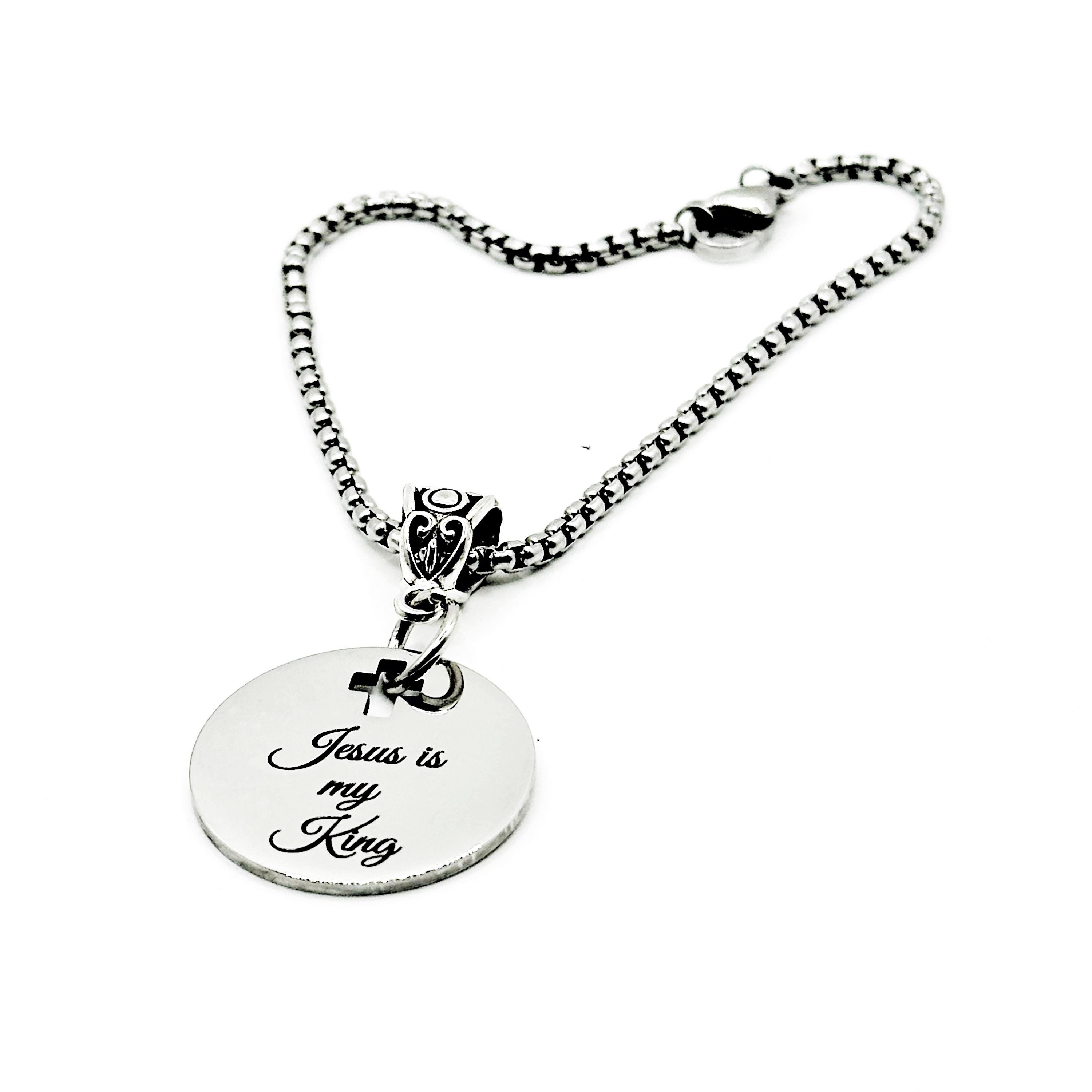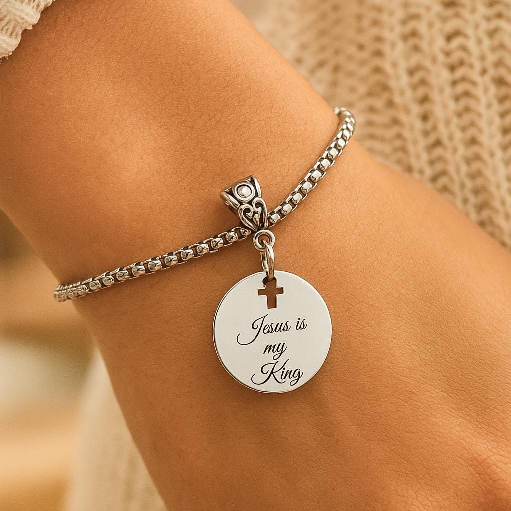 This stunning bracelet from JKCE Designs beautifully combines style and faith. The stainless steel box chain features a 25mm engraved charm that reads “Jesus is my King” in elegant Great Vibes font, with a delicate cross cutout at the top where the charm connects to its detailed bail. Available in your choice of lengths, this bracelet is both durable and timeless — a perfect way to express devotion, encouragement, and belief. It makes a meaningful gift for birthdays, confirmations, or any occasion of faith.