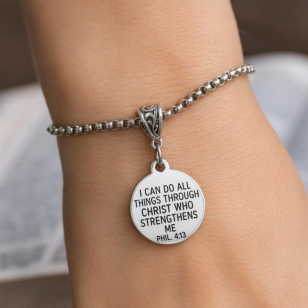 This elegant stainless steel bracelet from JKCE Designs features a beautifully engraved charm that reads, “I CAN DO ALL THINGS THROUGH CHRIST WHO STRENGTHENS ME. PHIL. 4:13.” The charm measures approximately 19mm and hangs from a durable stainless steel rolo box chain, available in your choice of lengths. Its timeless design makes it perfect for everyday wear or as a meaningful gift for someone special. A beautiful reminder of faith, strength, and perseverance.